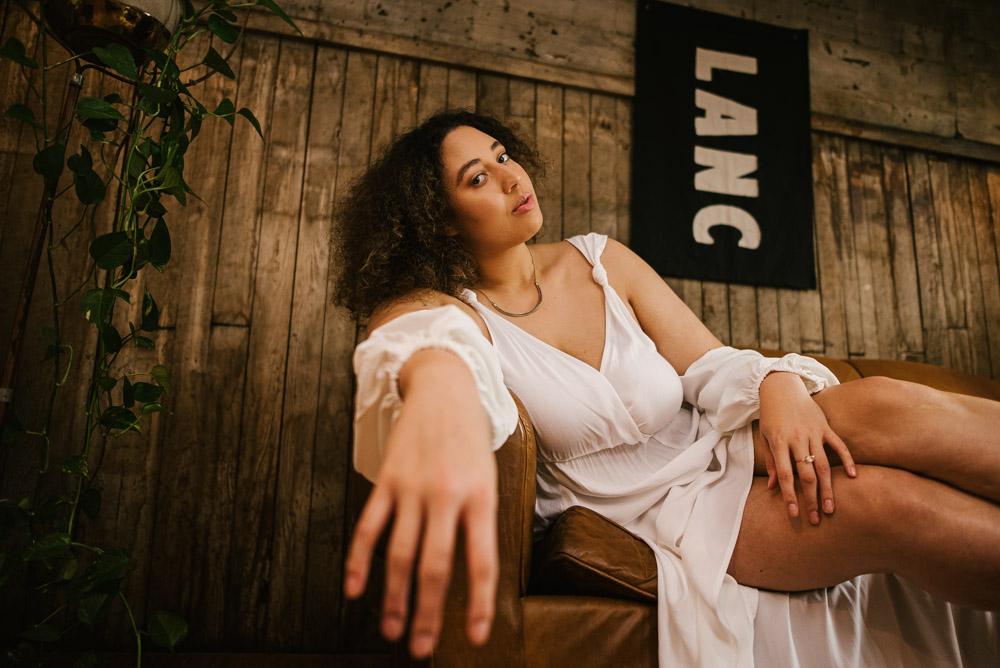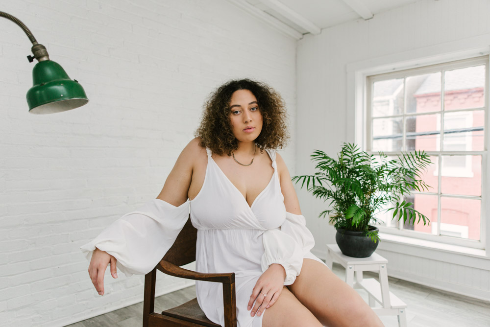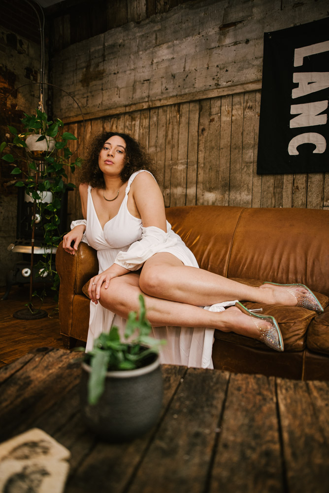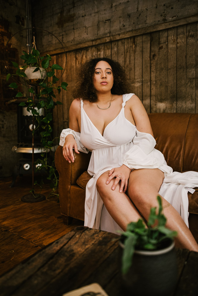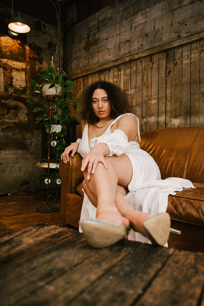 Ashlyn and I met up at the Hingework studio in Lancaster, PA. The large, white photo space was perfect for the images Ashlyn had in mind and complemented her flowing, white dress. Vintage furniture, as well as plants also helped add some flavor. Finally, we also took advantage of the lounge room adjoining the studio. The room is full of character left from the building’s origins as a cigar box factory.