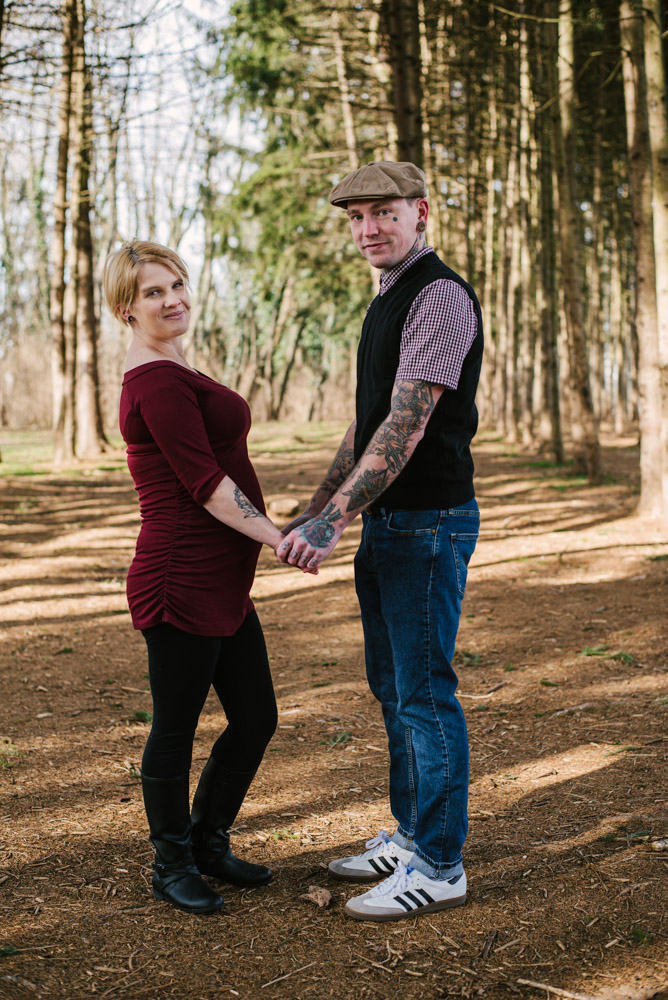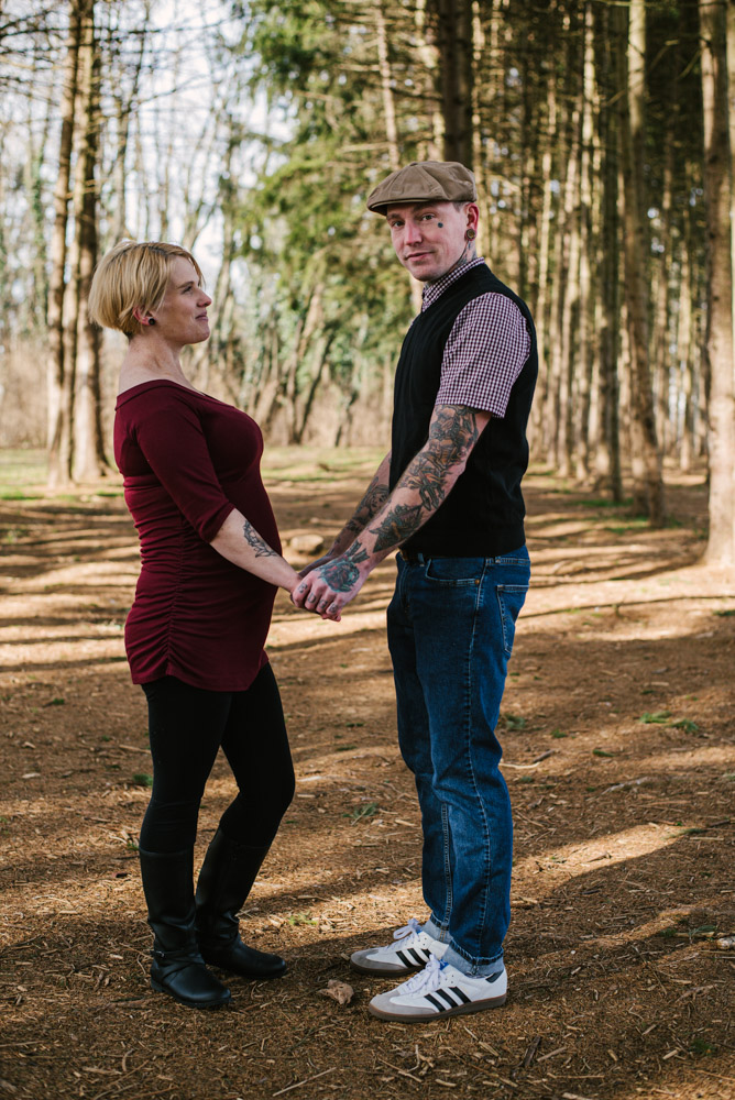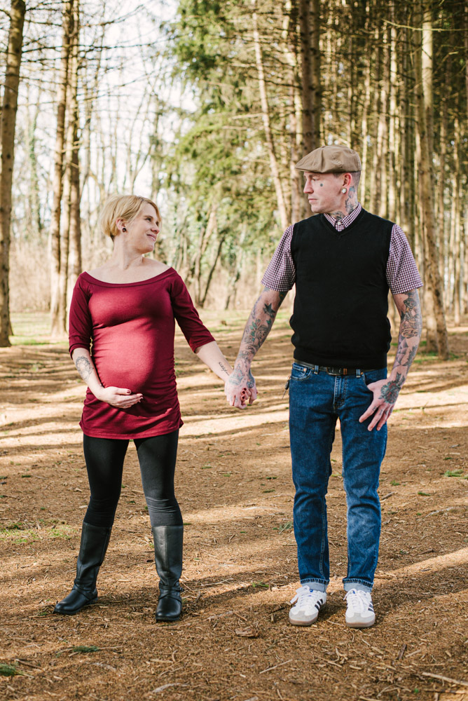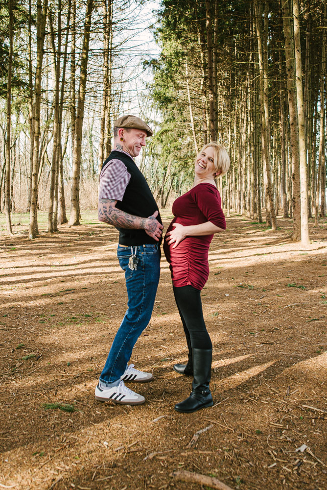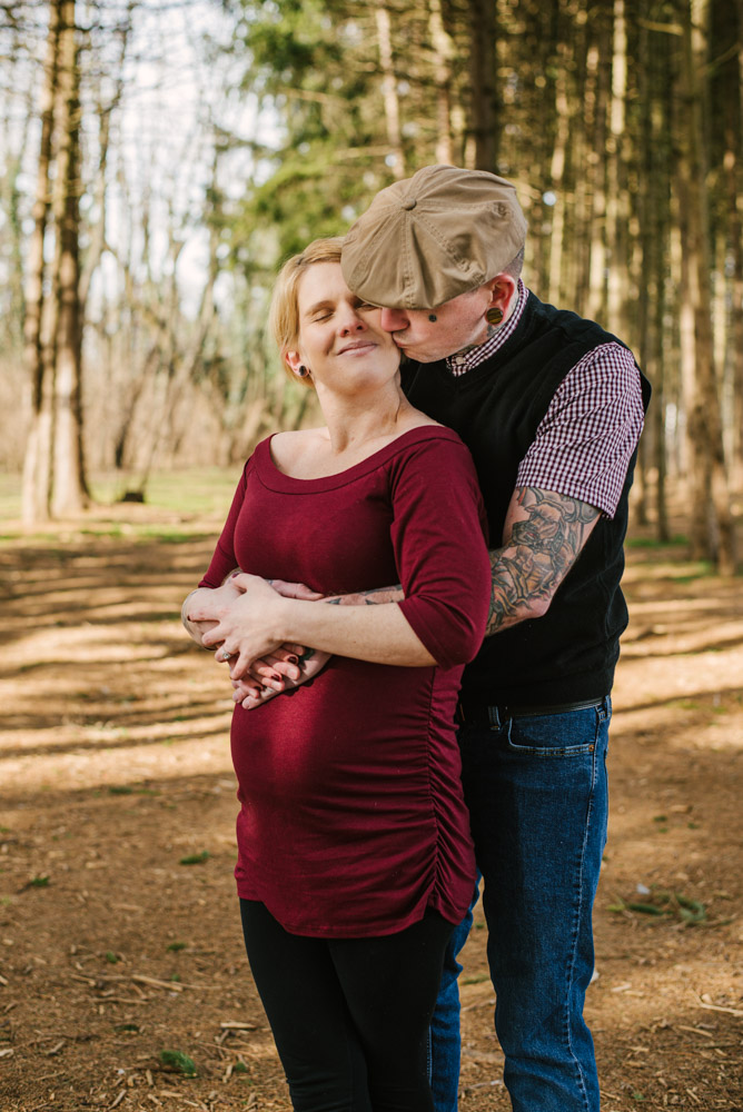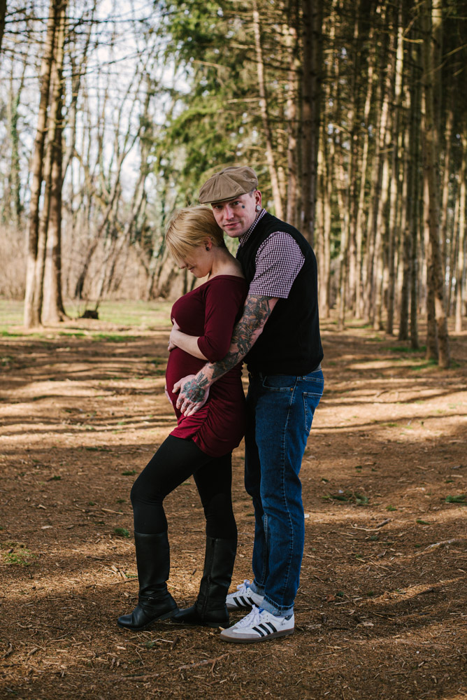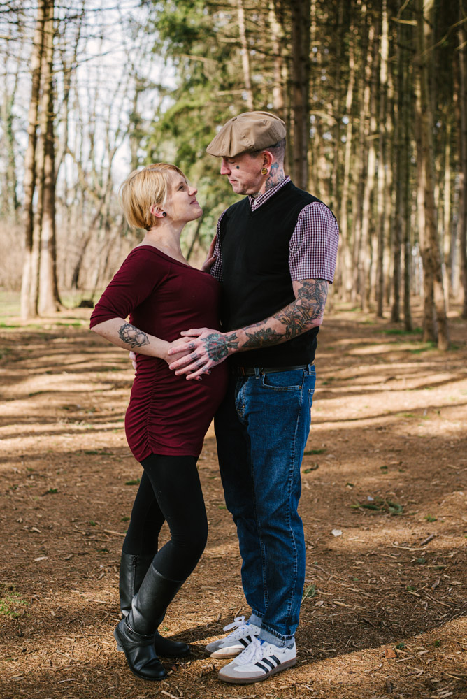 Brittany loved the idea of capturing these maternity, couple portraits at Overlook Park which has a beautiful, evergreen, tree grove. The grove has a fairytale feel to it and is a great place to shoot any time of year. It always looks photogenic. You’d never know that these portraits were captured on a very cold winter day. These two braved the elements, but they didn’t mind snuggling for photos to keep warm!