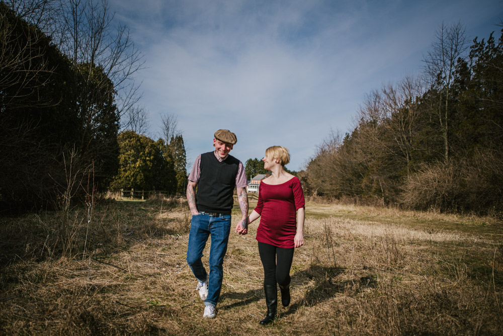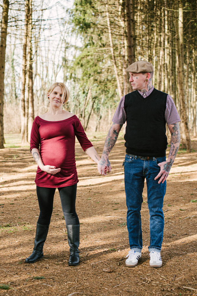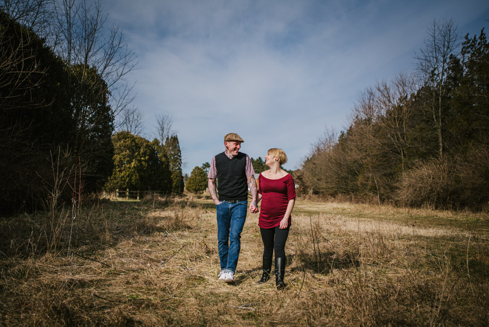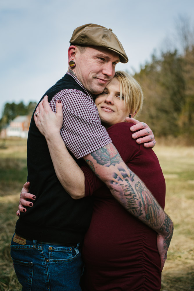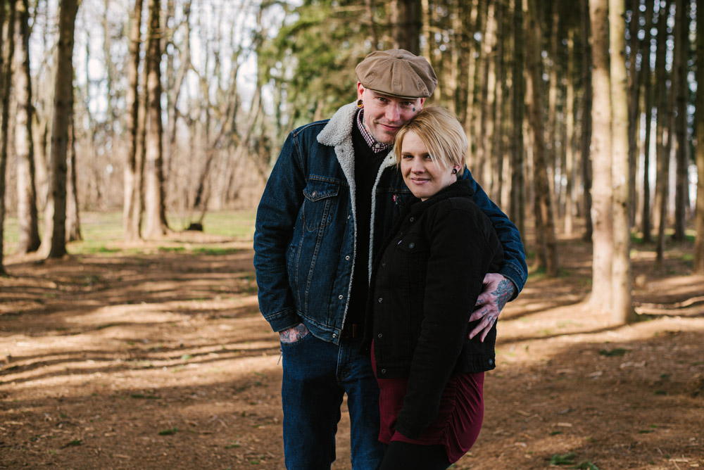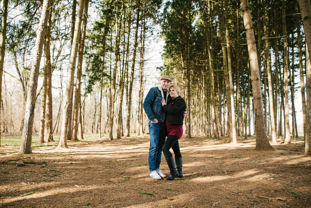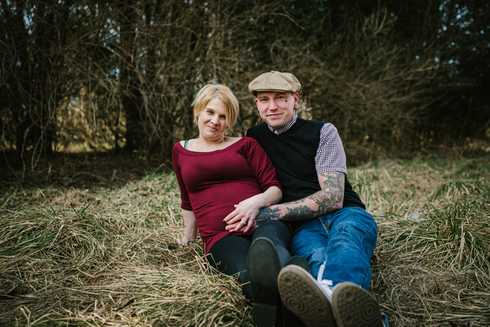 Brittany loved the idea of capturing these maternity, couple portraits at Overlook Park which has a beautiful, evergreen, tree grove. The grove has a fairytale feel to it and is a great place to shoot any time of year. It always looks photogenic. You’d never know that these portraits were captured on a very cold winter day. These two braved the elements, but they didn’t mind snuggling for photos to keep warm!
