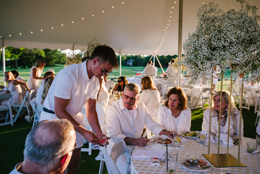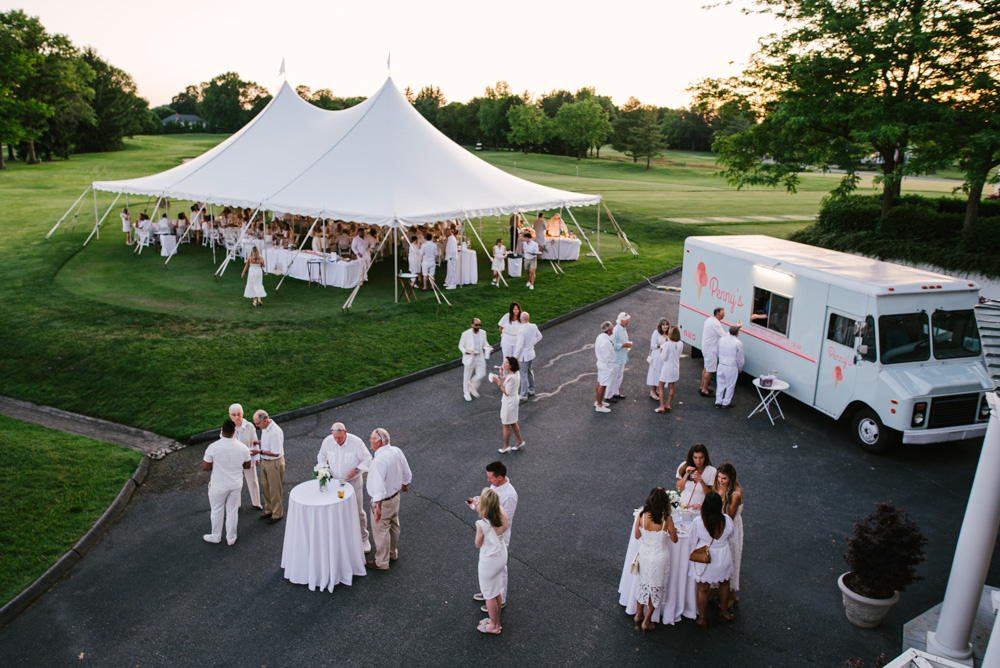 Unlike the common tradition of diners providing their own meals, tables, chairs, linens, etc. the guests of Bent Creek’s party were treated to a a fantastic meal, live music, Penny’s ice cream truck, and beautiful tables and place settings prepared for them. The event took place in the Clubhouse and on the greens under two tents.