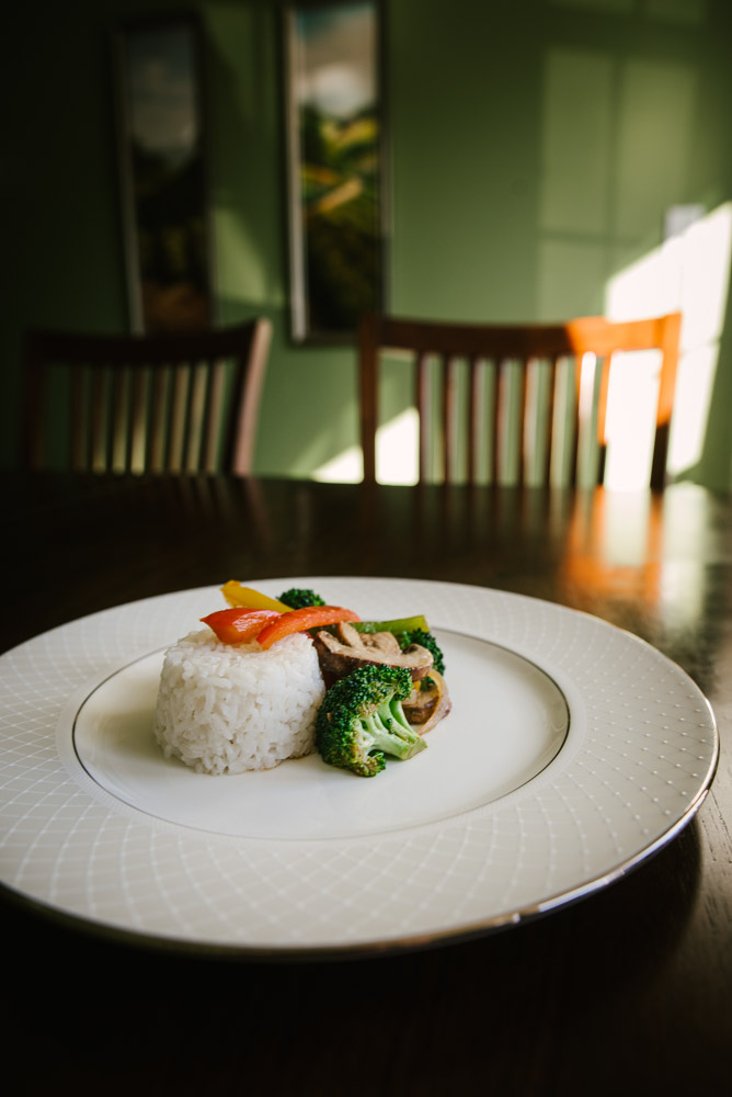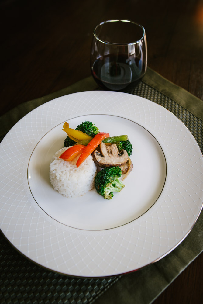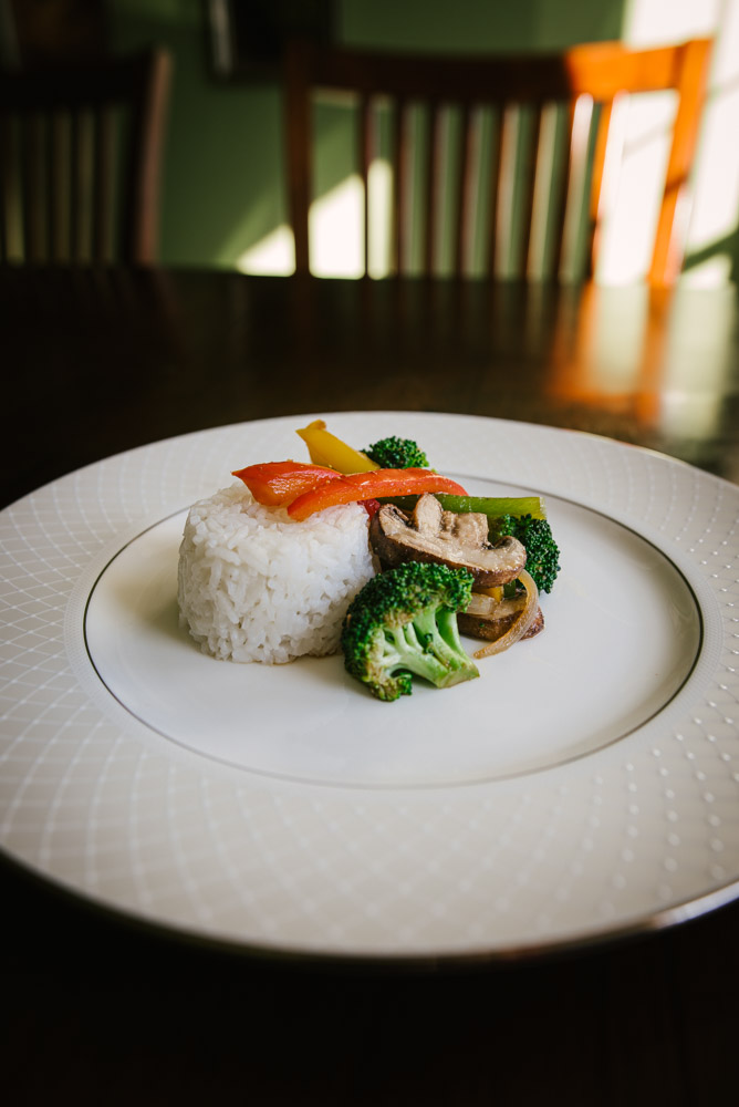 Okay—we may have taken a turn from the traditional Italian dishes here, but this stir fry was delicious nonetheless! Fresh cooked rice plated with fresh peppers, mushrooms, and broccoli.