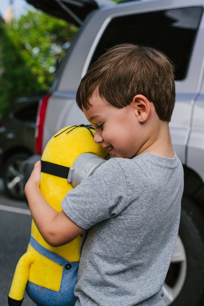 Each year, Hugh also has a special, themed t-shirt. This year’s theme was Star Wars. Hugh is very excited to watch Star Wars this year, and while it will be his first time see the movie, he already know all the characters’ names. At the time of this shoot, Hugh had also just discovered the movie Despicable Me. He is obsessed with his new, talking Minion Tim plush!