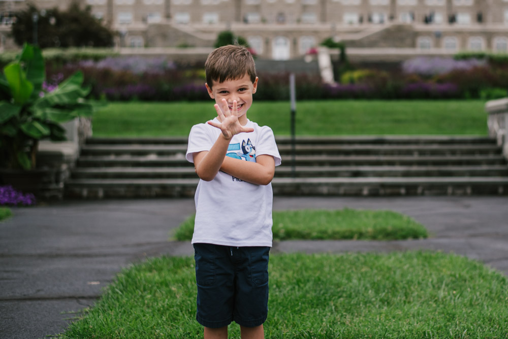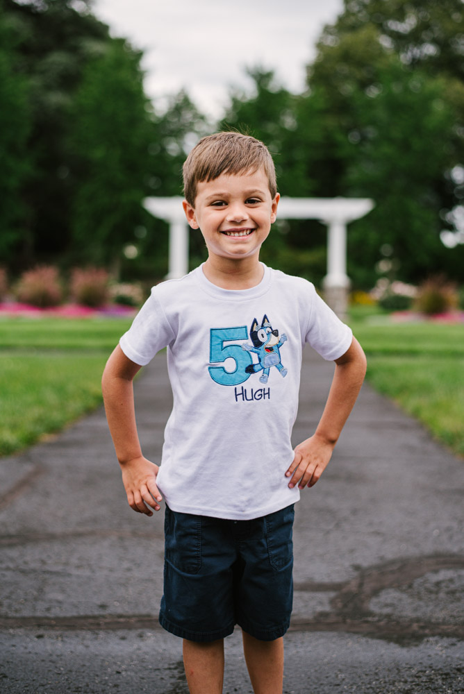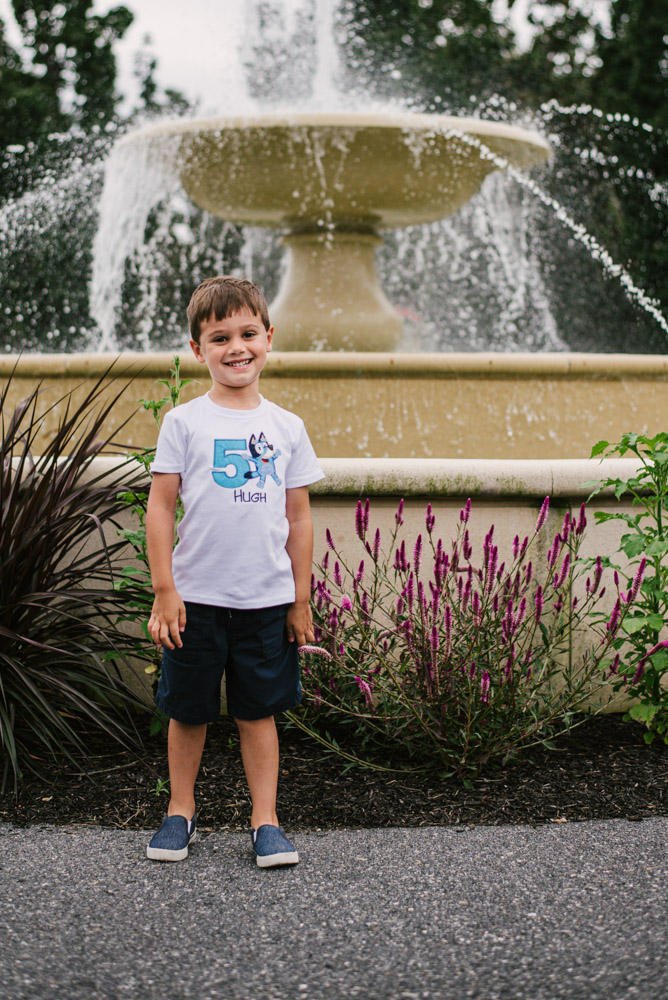 Hugh turned 5 years old, which means it was time for his annual birthday photoshoot. Each year Hugh wears a special, custom t-shirt that matches the theme of his birthday party. This year he was all about Bluey—an Australian cartoon about a Blue Heeler puppy. This year the gardens at Masonic Village served as our photo setting.