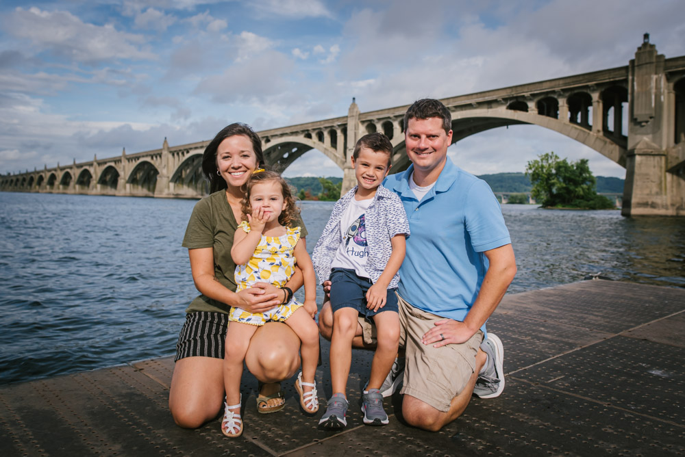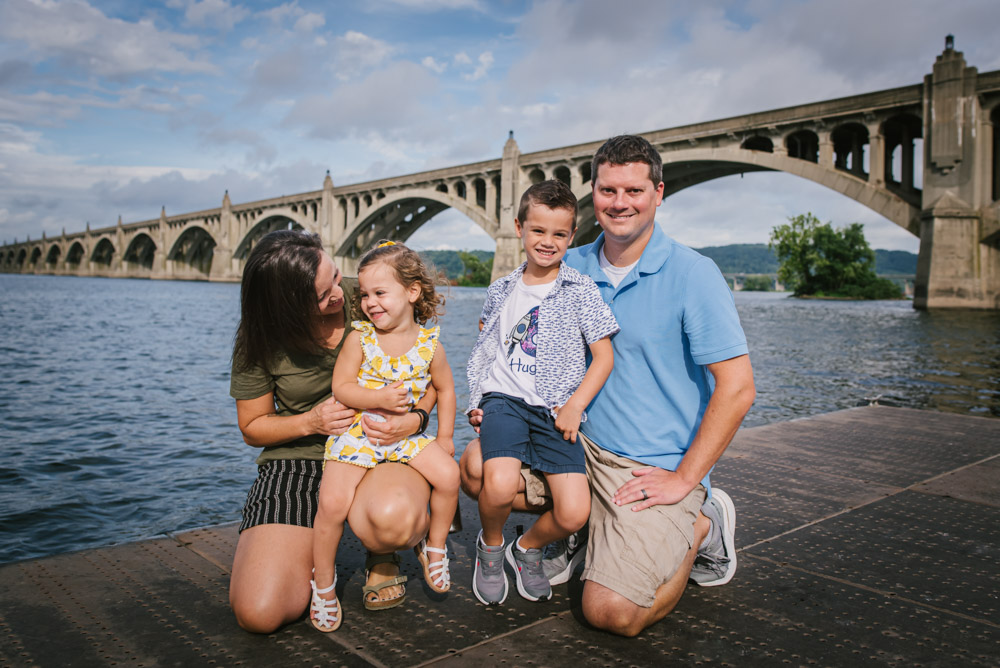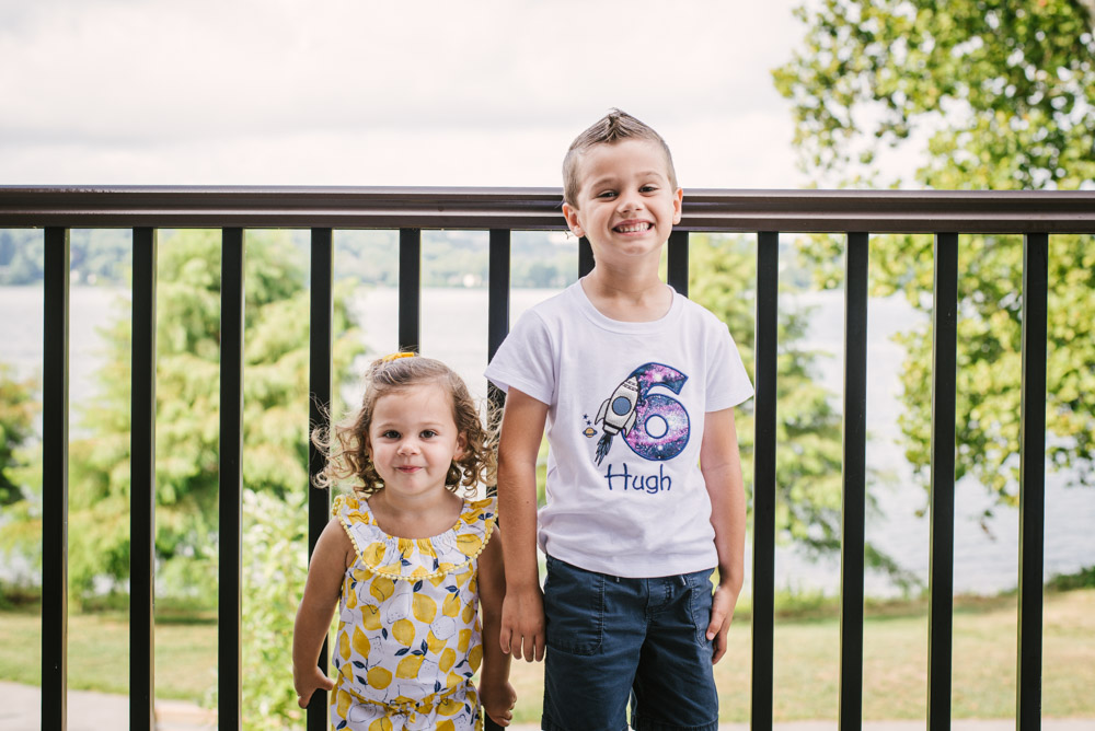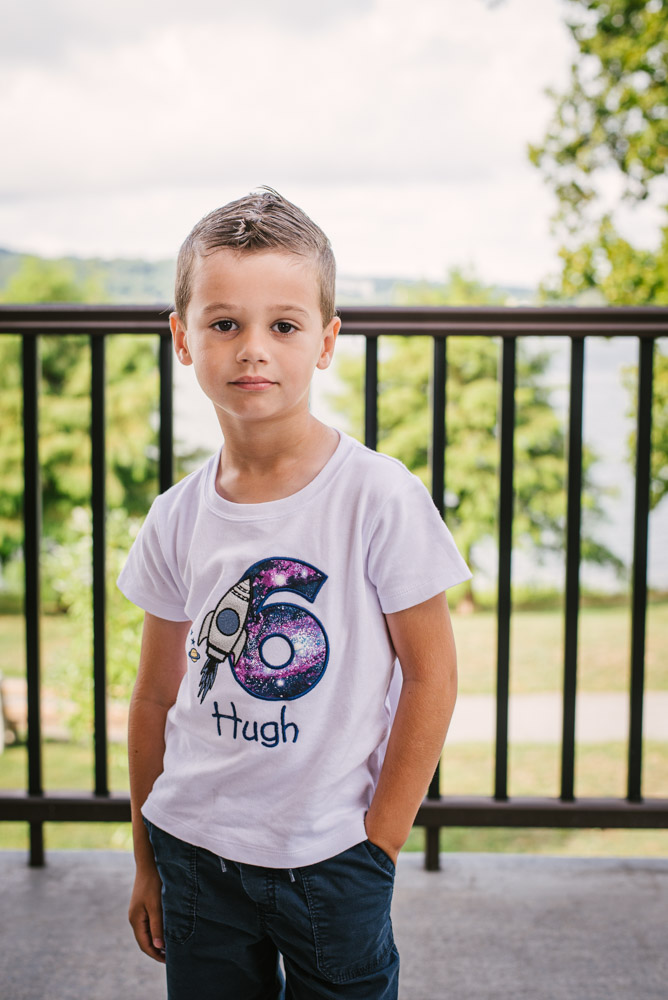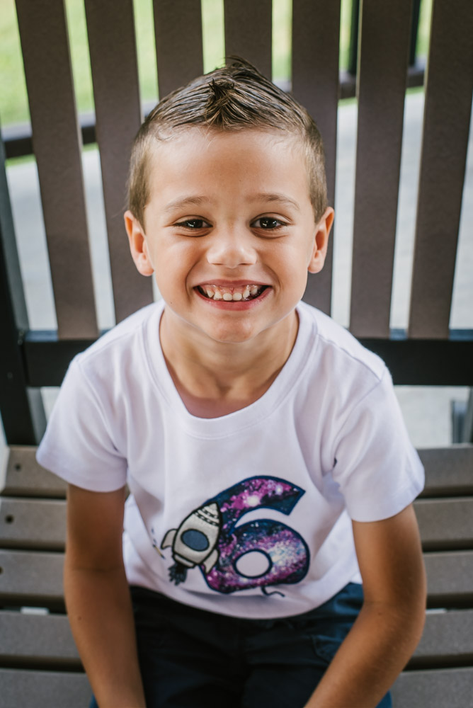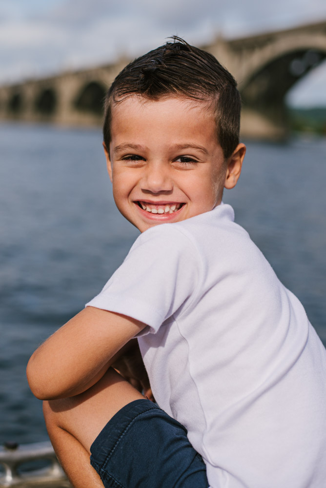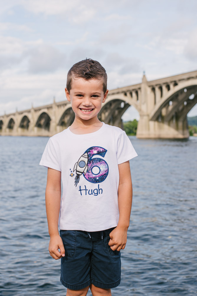 Hugh turned 6 years old! His family recently celebrated him with a space-themed party. And, as is tradition, Hugh had a personalized tee shirt matching his theme for his annual photos. This year’s birthday photos were captured on the Columbia, PA side of the Susquehanna River. A boat dock gave us the perfect opportunity for photos right on the water with the iconic Veterans Memorial Bridge (the Columbia-Wrightsville Bridge) in the background. We followed with some photos of the beautiful patio of the Columbia Crossing River Trails Center.