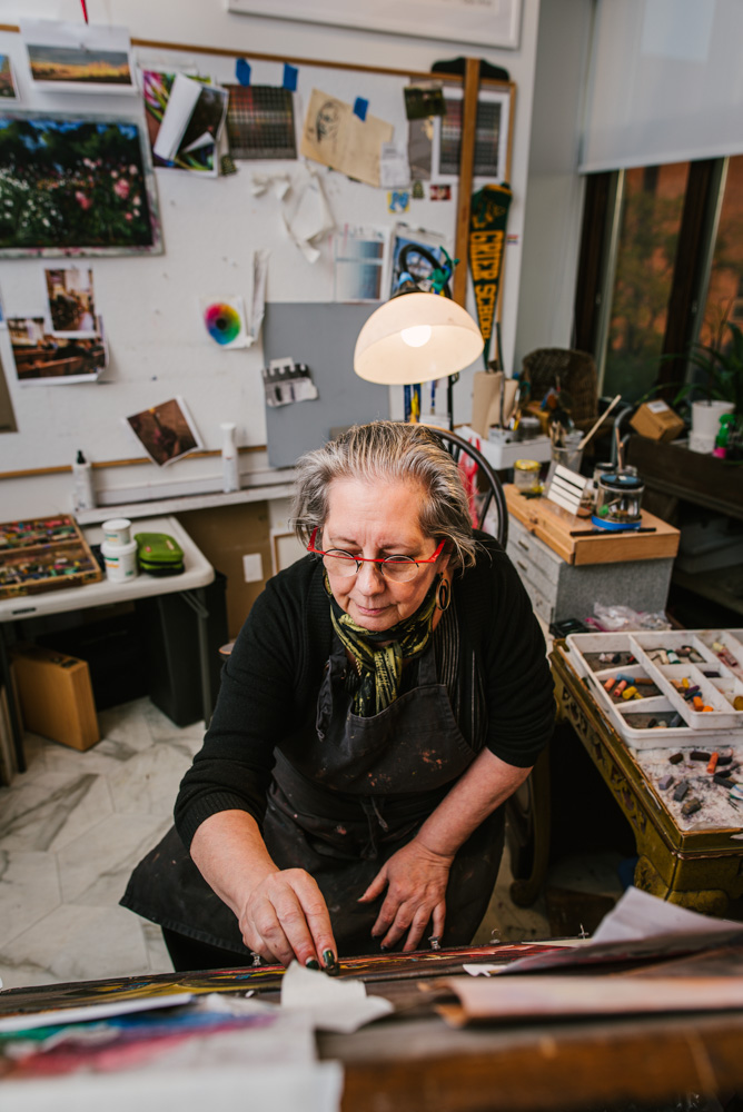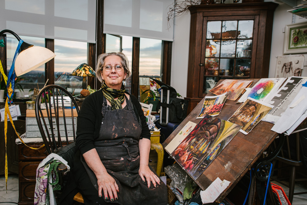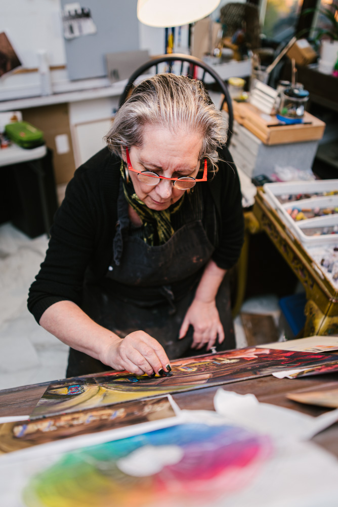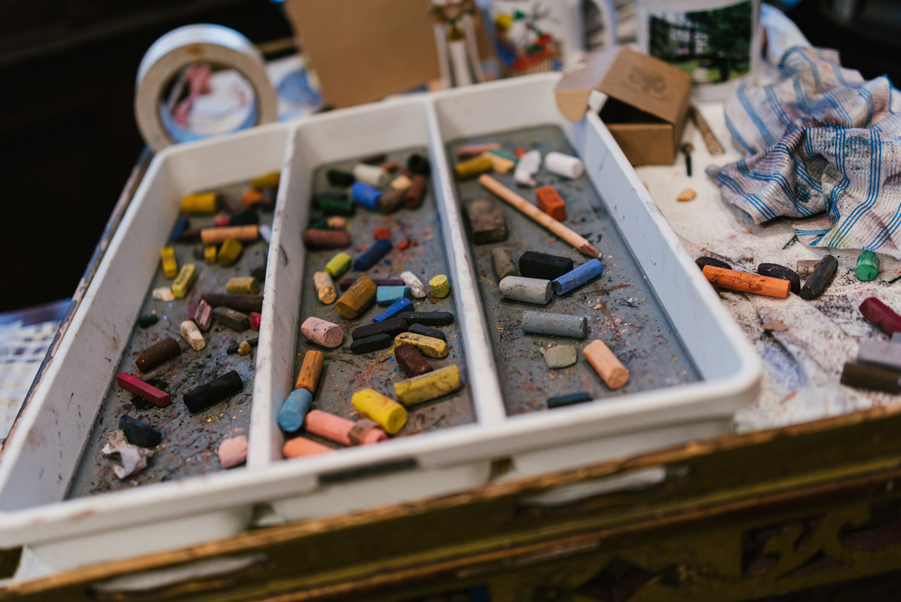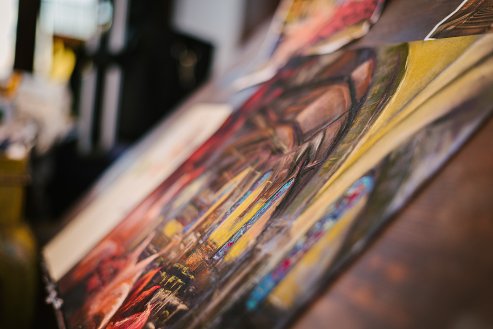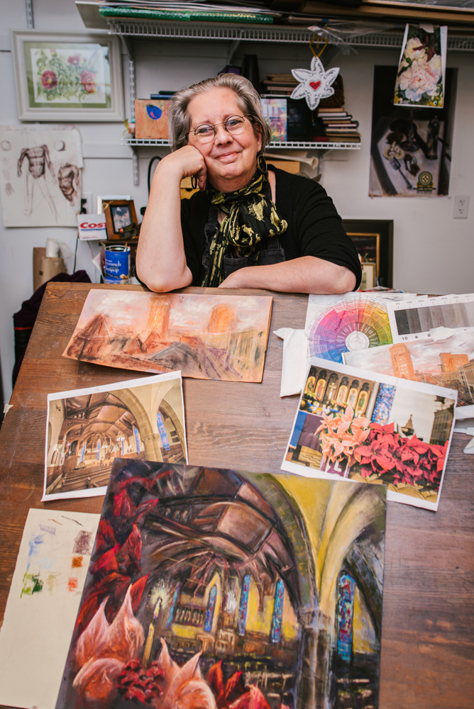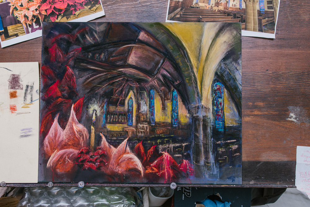 Isabel Lark is an accomplished pastel artist based in downtown Lancaster. I visited her at her beautiful home studio overlooking the center of the city to capture portraits and photos of a special art piece she had just completed. Isabel was tasked with creating artwork for Lancaster Theological Seminary’s annual Epiphany card. She in turn produced a stunning pastel drawing of a LTS’s Santee Chapel. Anyone familiar with LTS knows this iconic and beloved sanctuary which makes it perfect for this year’s card.