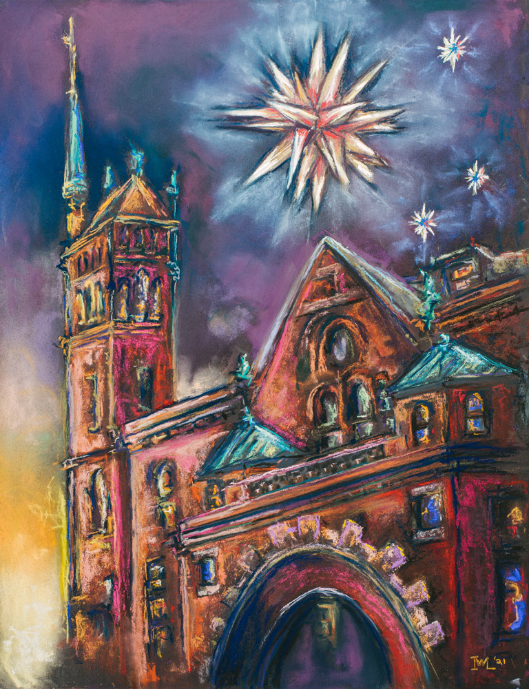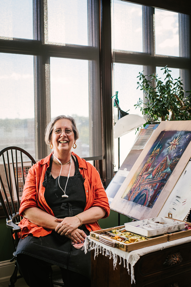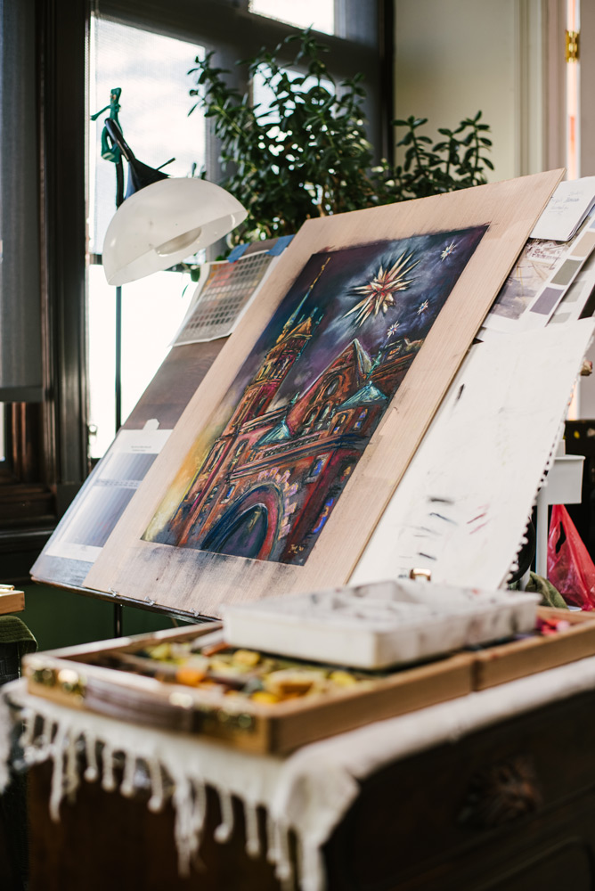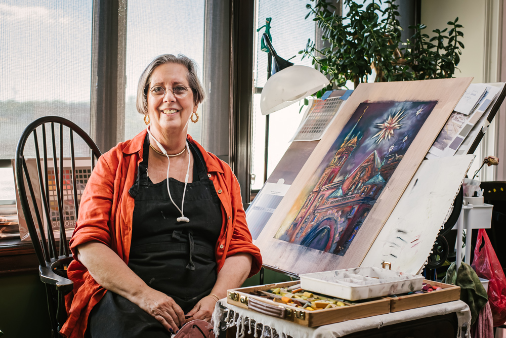 Isabel Lark is talented pastel artist based in downtown Lancaster. I visited her at her beautiful home studio overlooking the center of the city to capture portraits and photos of a special art piece she had just completed. Isabel was tasked with creating artwork for Lancaster Theological Seminary’s annual Epiphany card. She in turn produced a stunning pastel drawing of LTS’s Santee Chapel with the Epiphany star shining bright in the night sky above.