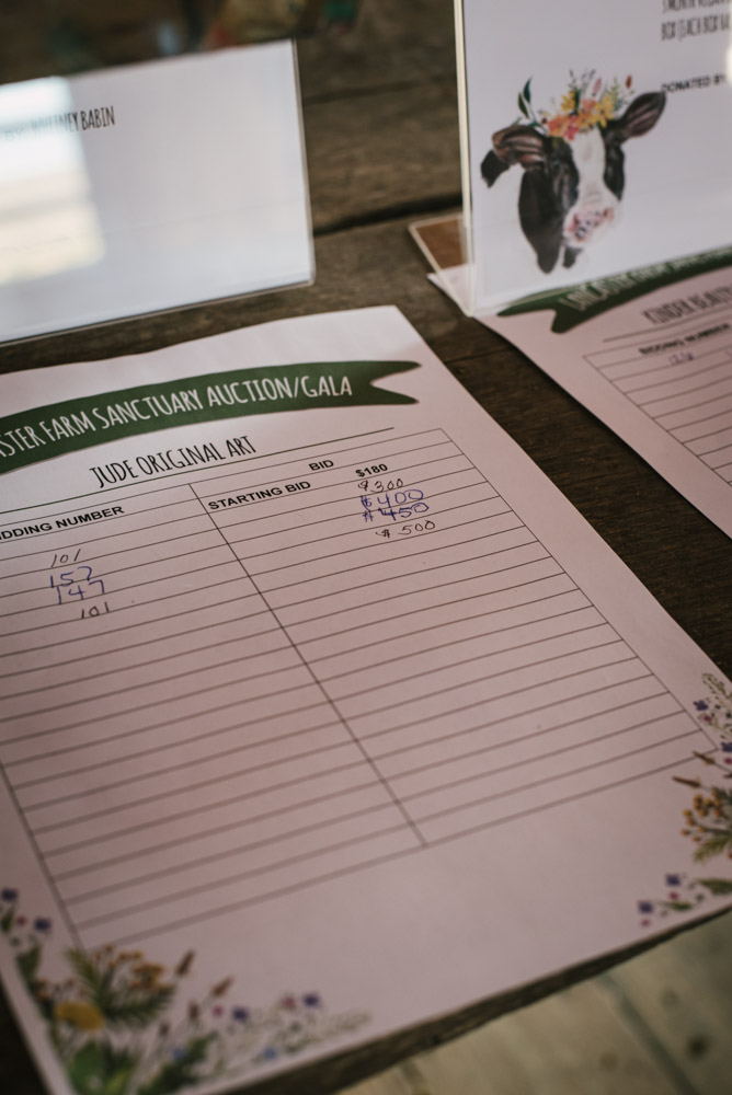 A delicious, all-vegan dinner including dessert was catered by The Scarlet Runner, the barn was filled with tons of great vegan products, artwork, and treats to bid on in a silent auction, and guests happily took self-guided tours around the sanctuary to meet the ducks, goats, pigs, horses, cows, and other four-legged friends. LFS volunteers were on hand at each station to answer questions and provide education on the sanctuary and animals.