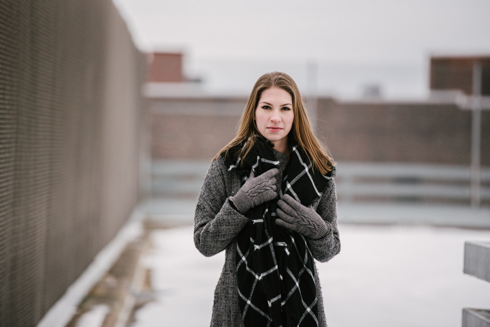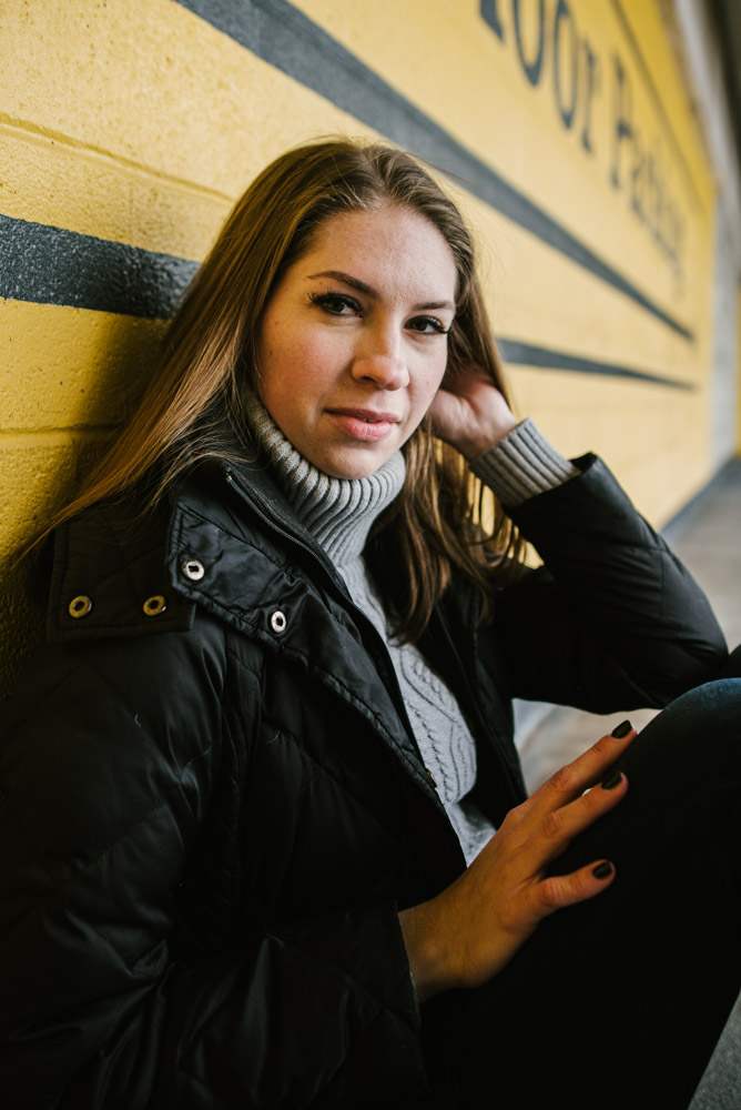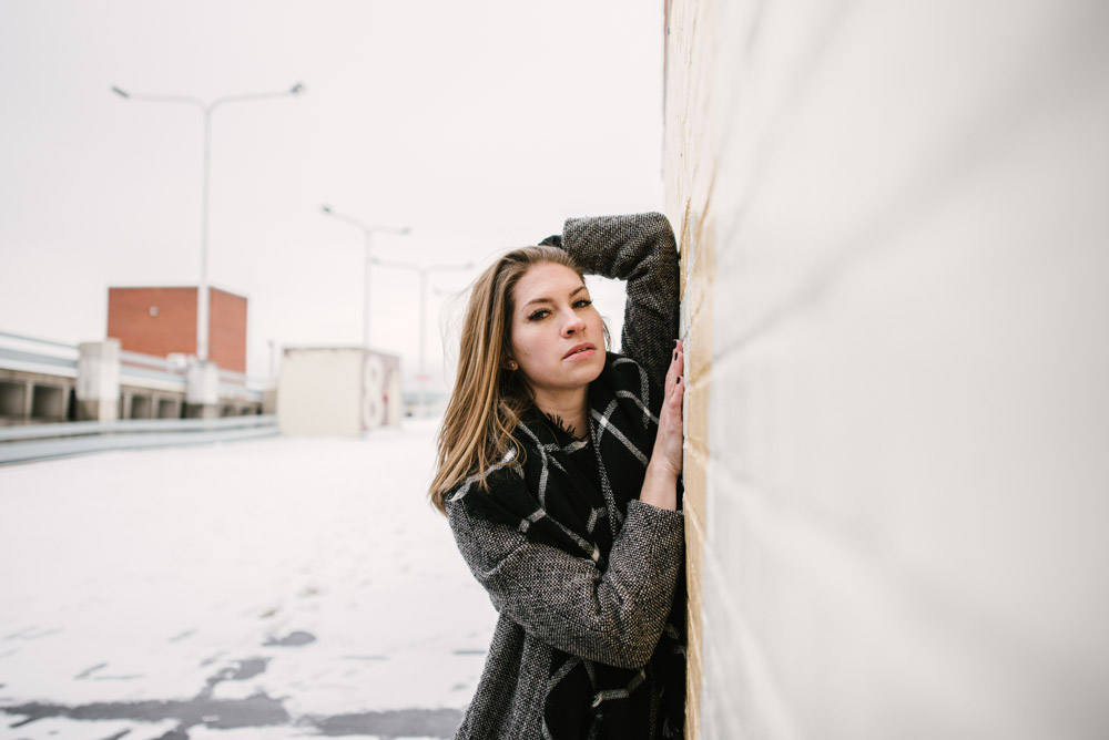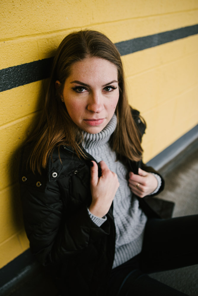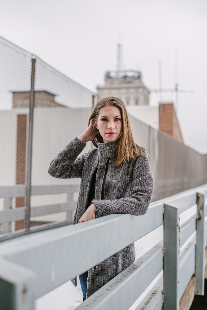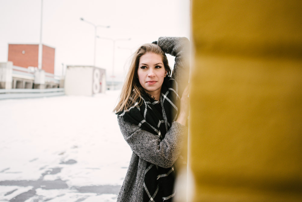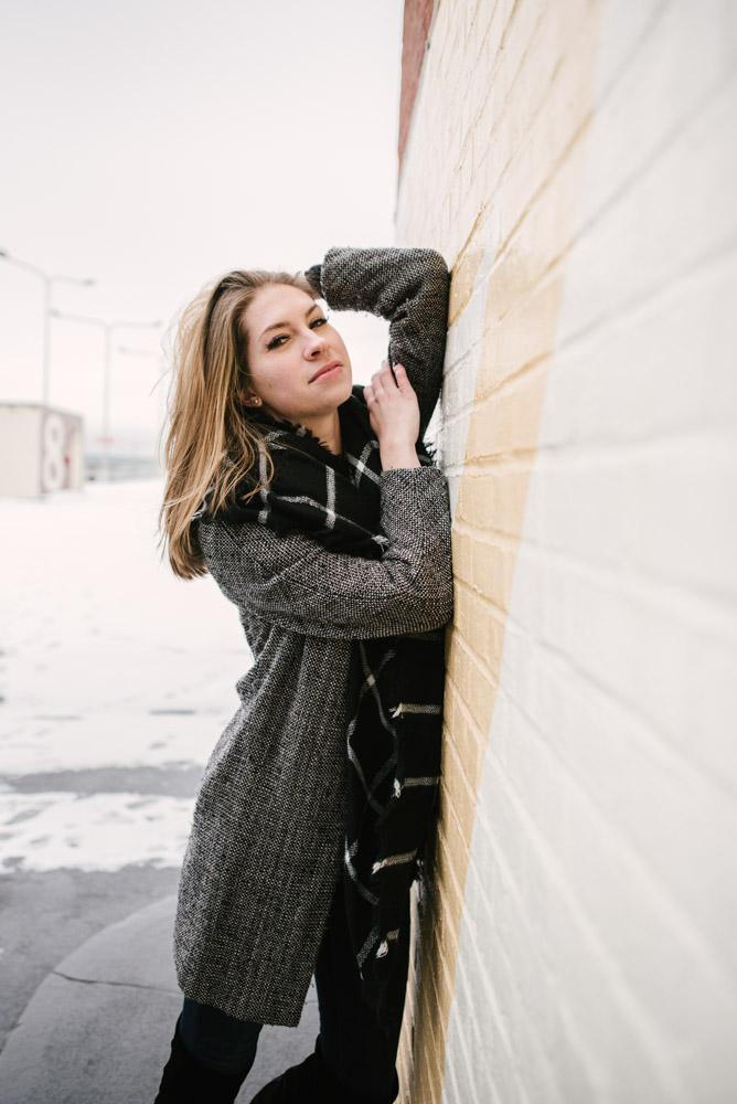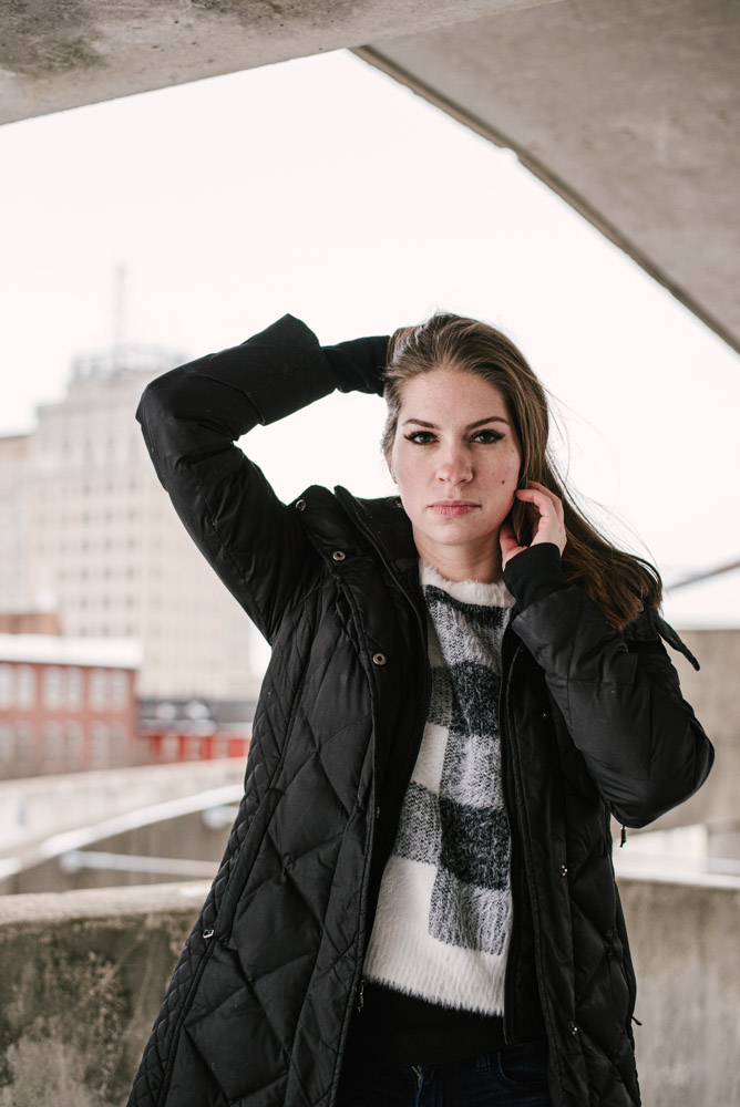 Laura and I met on a cold snowy day for winter portraits. The top floor of Price Street Garage made for a great playground for us to explore because it offered unique views of the city and creative architecture. The garage is locally famous for it’s spiraling exit ramp that delivers a striking accent to the cityscape. We were sure to use this feature to our advantage while we were there! A pop of a bright yellow wall also provided a great backdrop for us.