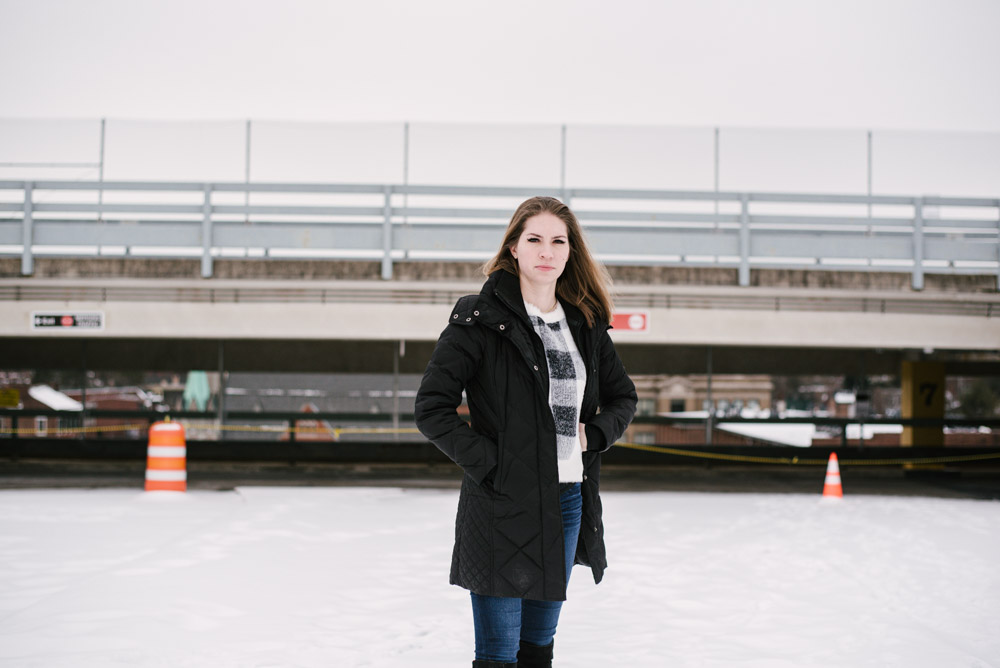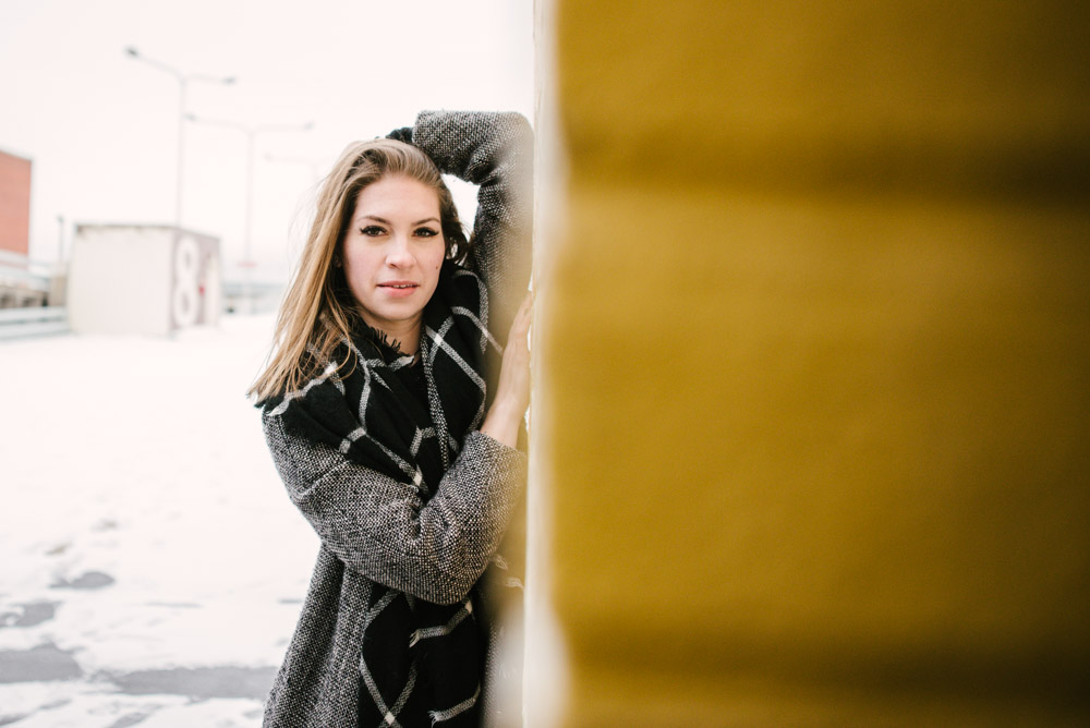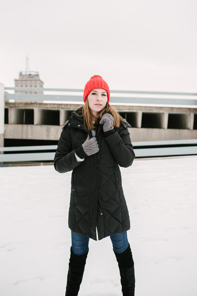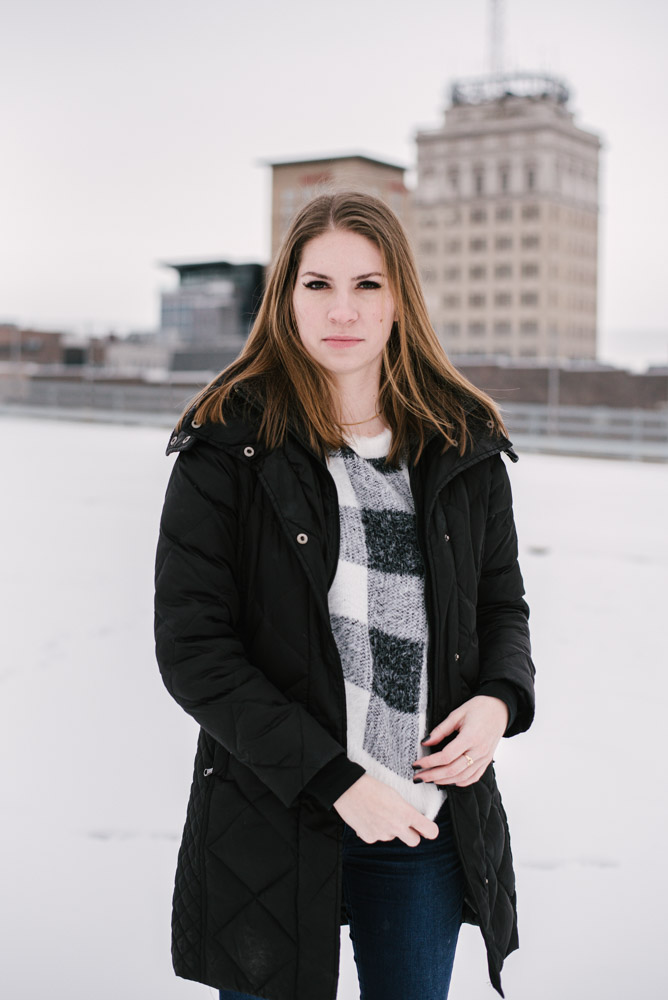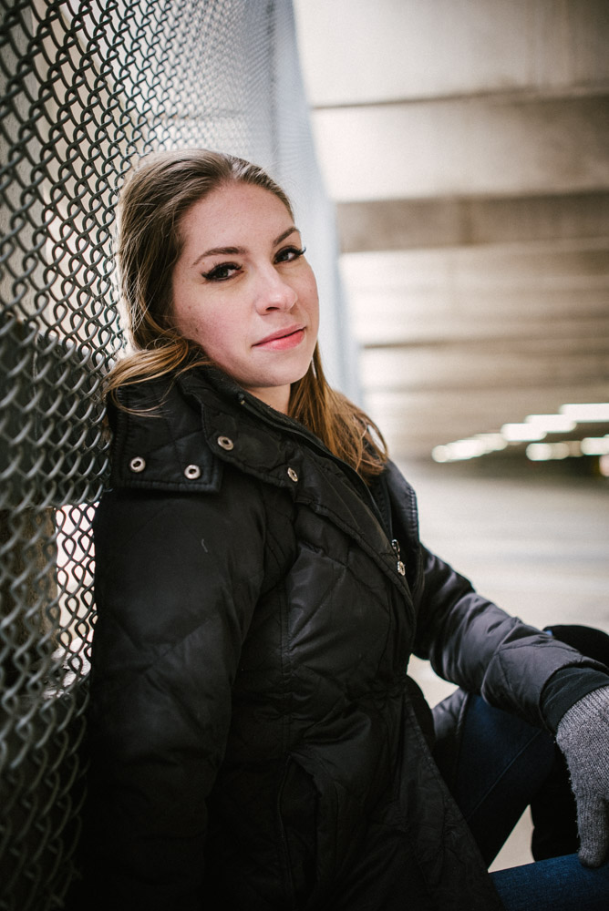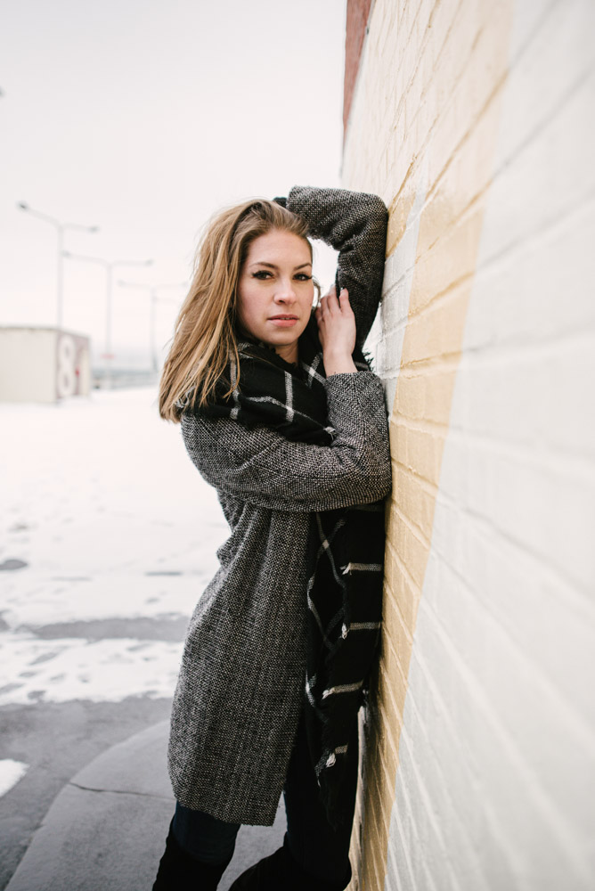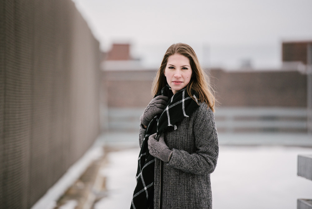 Laura and I met on a cold snowy day for winter portraits. The top floor of Price Street Garage made for a great playground for us to explore because it offered unique views of the city and creative architecture. The garage is locally famous for it’s spiraling exit ramp that delivers a striking accent to the cityscape. We were sure to use this feature to our advantage while we were there! A pop of a bright yellow wall also provided a great backdrop for us.