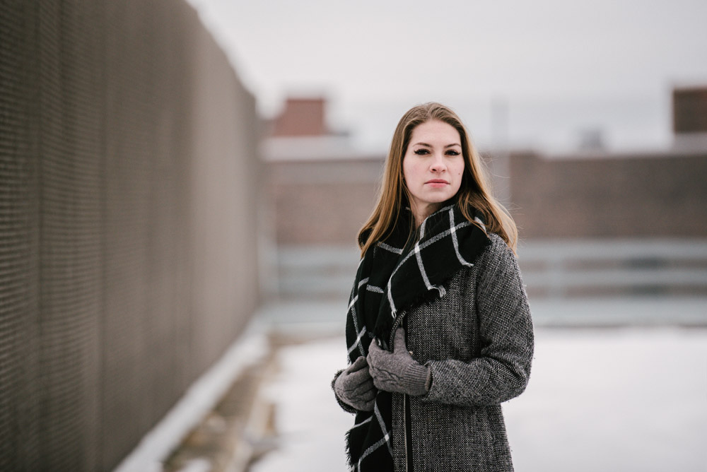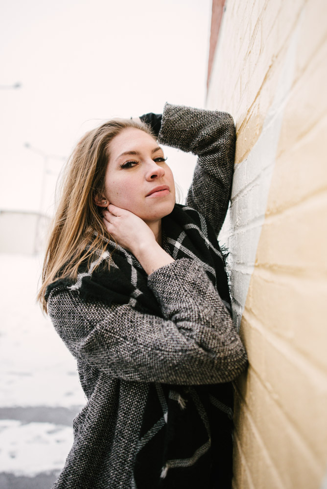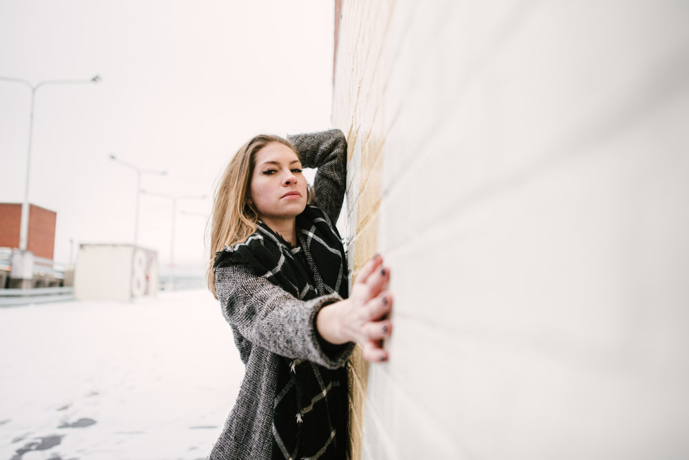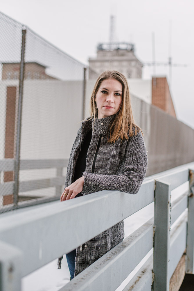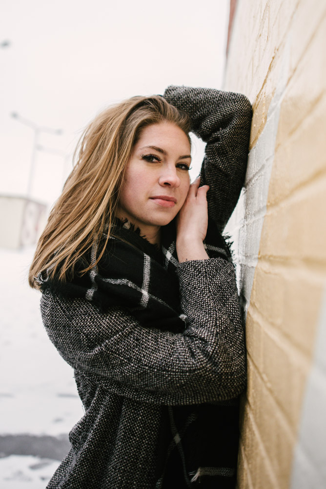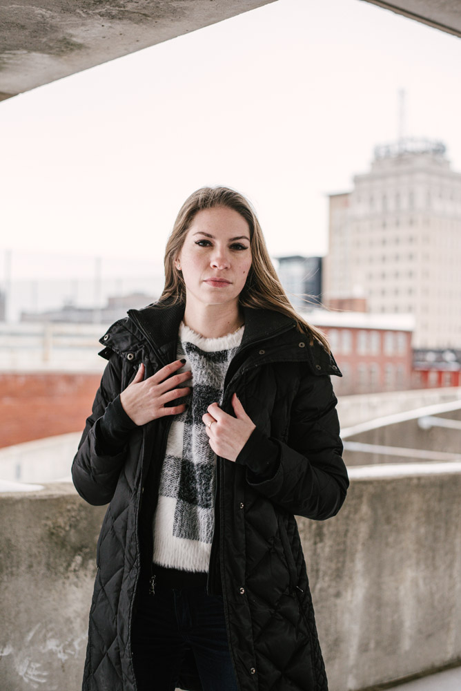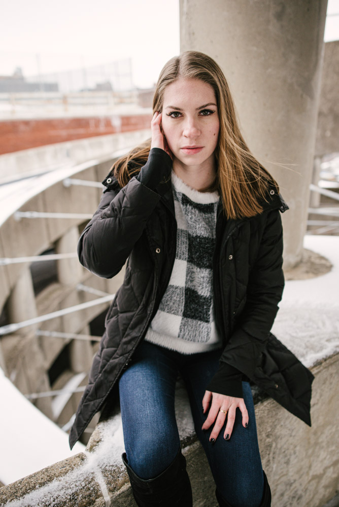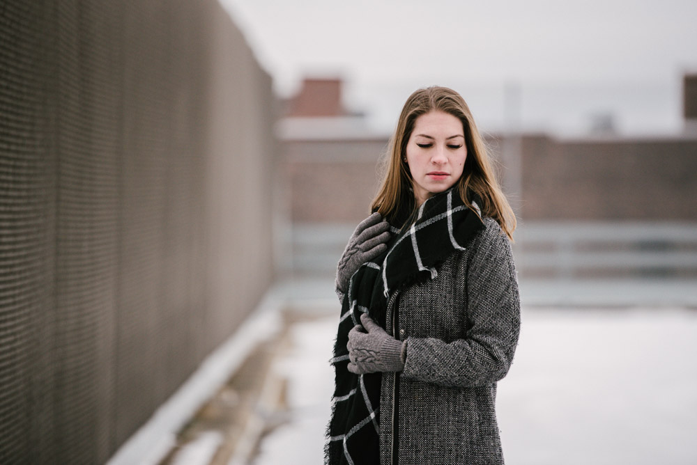 Laura and I met on a cold snowy day for winter portraits. The top floor of Price Street Garage made for a great playground for us to explore because it offered unique views of the city and creative architecture. The garage is locally famous for it’s spiraling exit ramp that delivers a striking accent to the cityscape. We were sure to use this feature to our advantage while we were there! A pop of a bright yellow wall also provided a great backdrop for us.