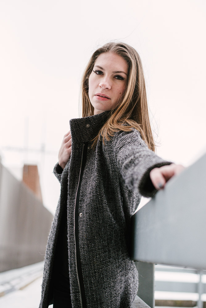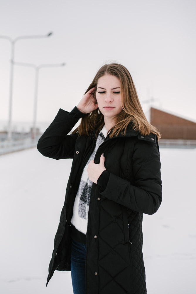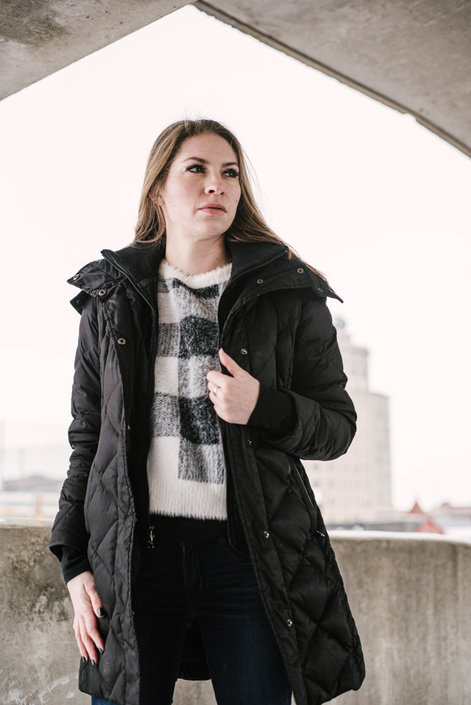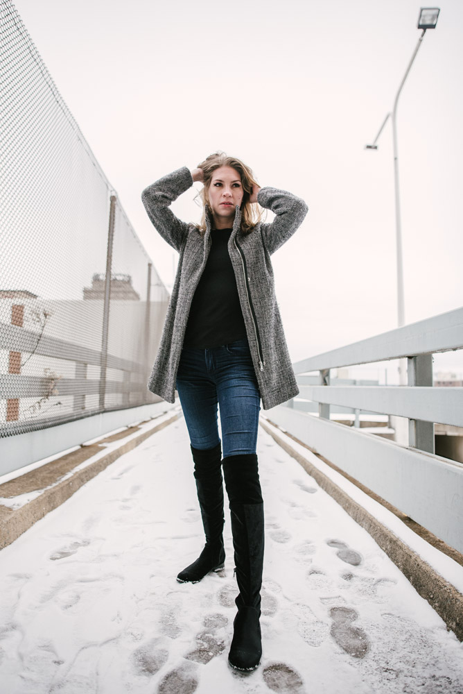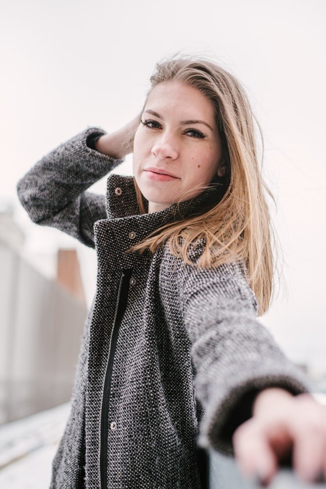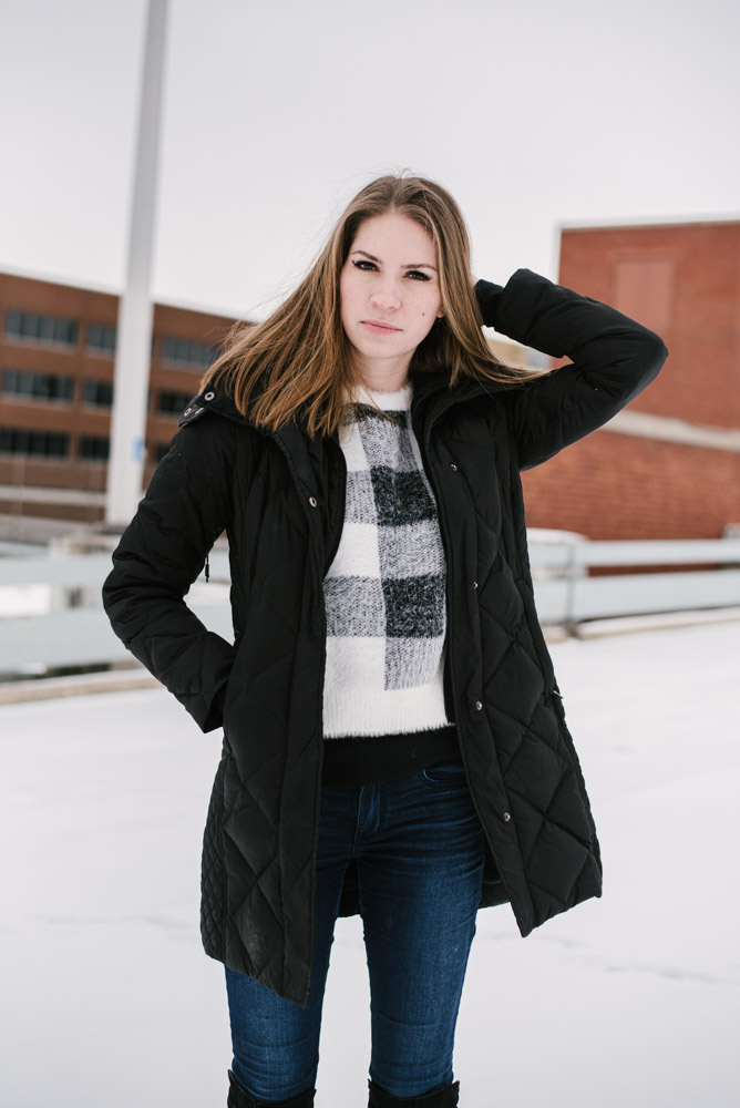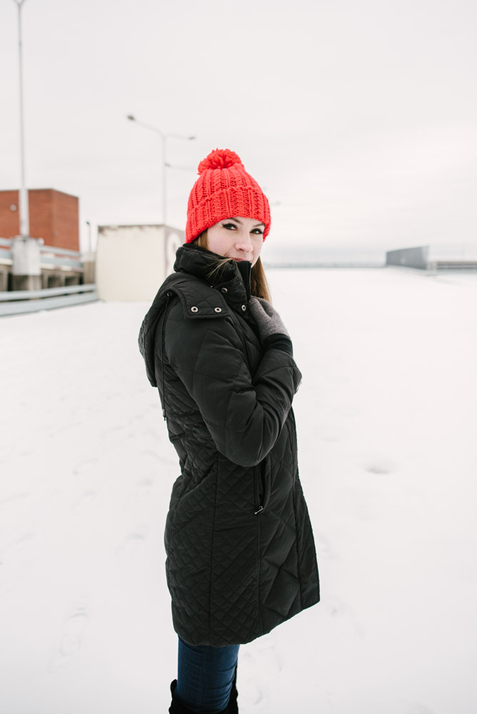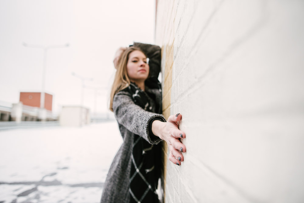 Laura and I met on a cold snowy day for winter portraits. The top floor of Price Street Garage made for a great playground for us to explore because it offered unique views of the city and creative architecture. The garage is locally famous for it’s spiraling exit ramp that delivers a striking accent to the cityscape. We were sure to use this feature to our advantage while we were there! A pop of a bright yellow wall also provided a great backdrop for us.