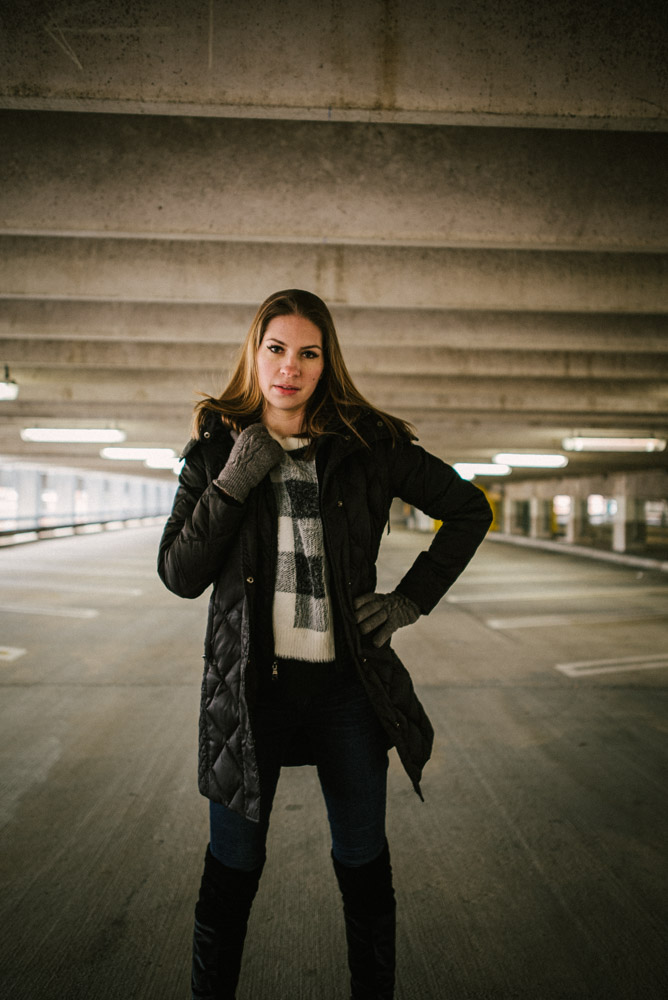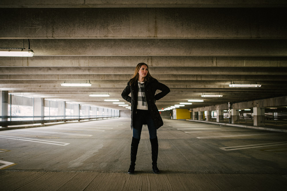 Before leaving the garage and ending the session, we experimented with taking some portraits inside the garage. The repeating lines of concrete from the floor above added a lot of depth and perspective to the photos. Luckily, there were no cars around to break up the vast, open space!