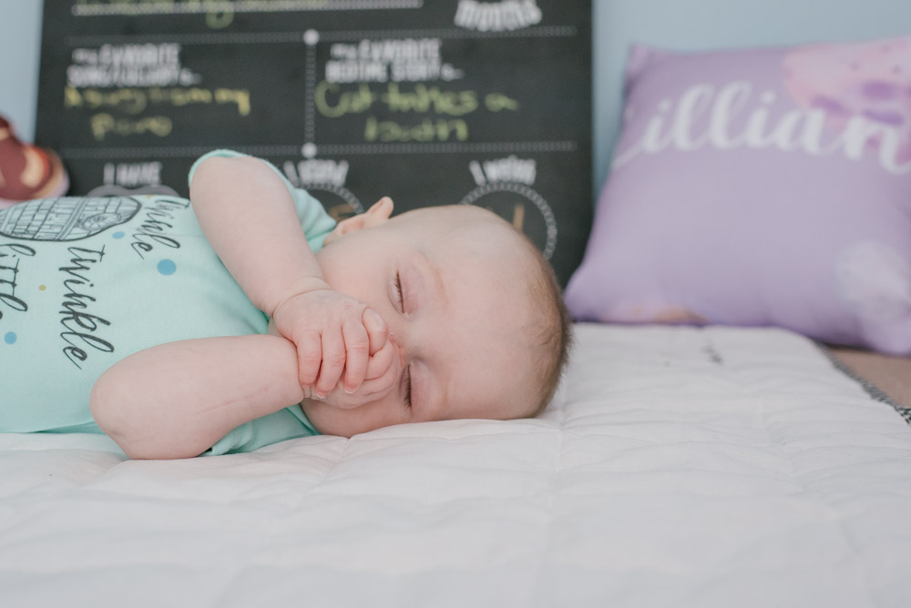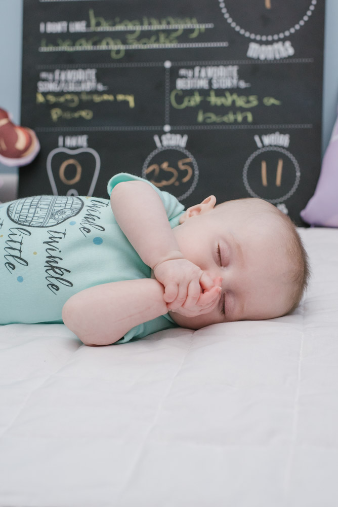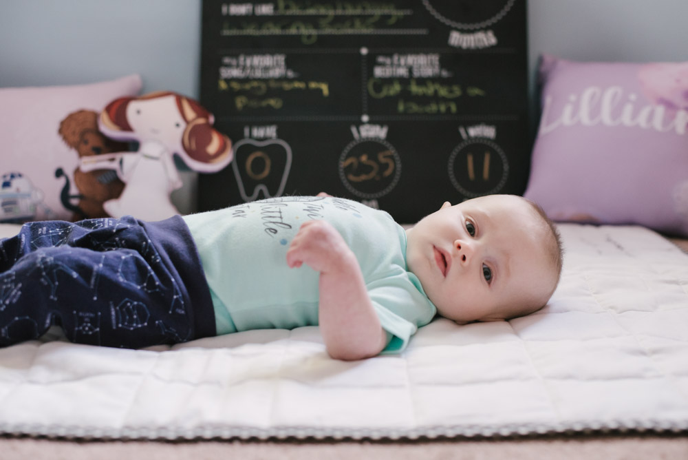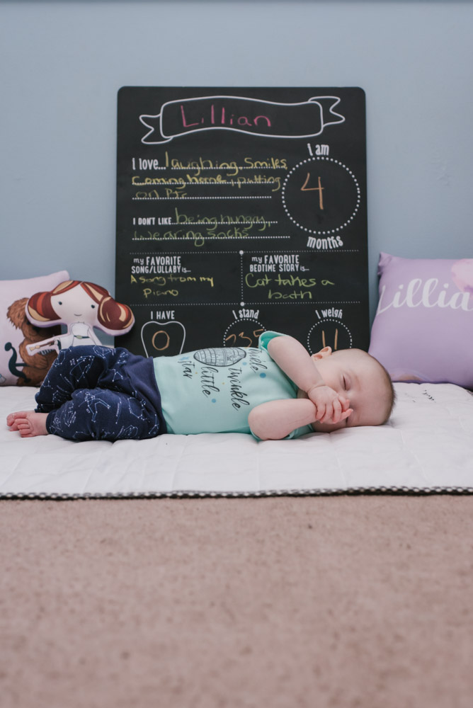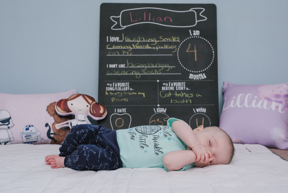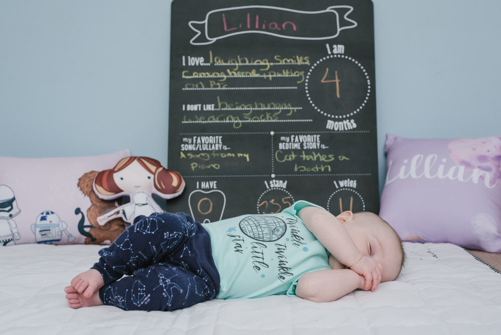 Baby Lily is four months old. Photography is a great way to remember the fleeting moments of a quickly-growing baby! And, it’s always fun to add some personality to the photos through props and clothing. This month Lily wore a Star Wars-inspired onesie and pants. She posed with her chalkboard of ‘Lily facts.’