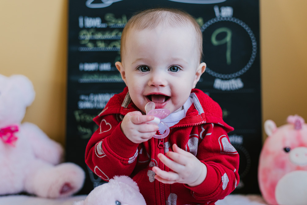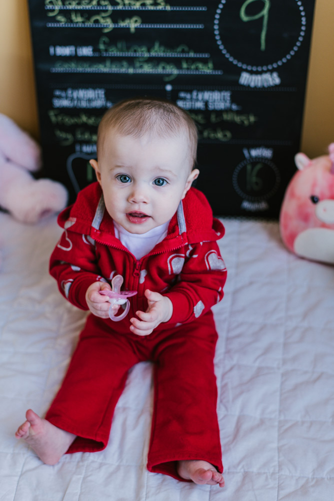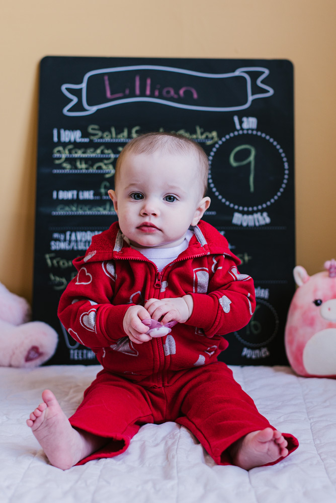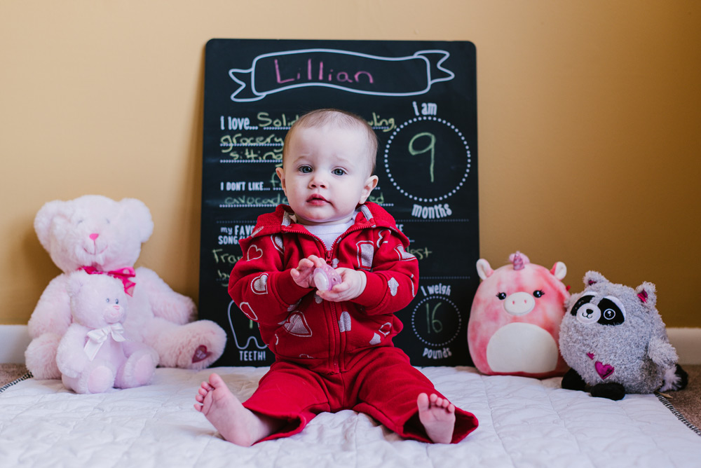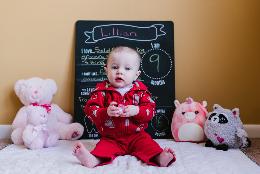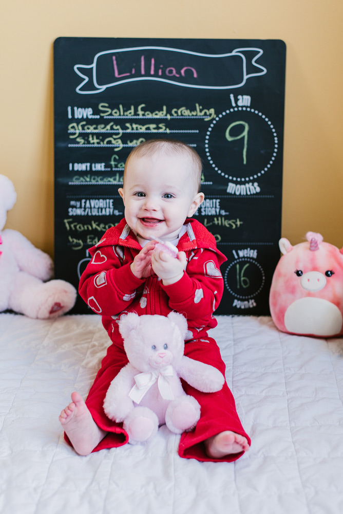 Baby Lily is nine months old. Photography is a great way to remember the fleeting moments of a quickly-growing baby! And, it’s always fun to add some personality to the photos through props and clothing. This month Lily celebrated Valentine’s Day with her heart outfit and favorite pink plushies.
