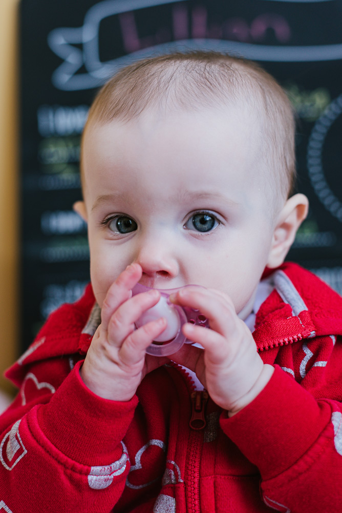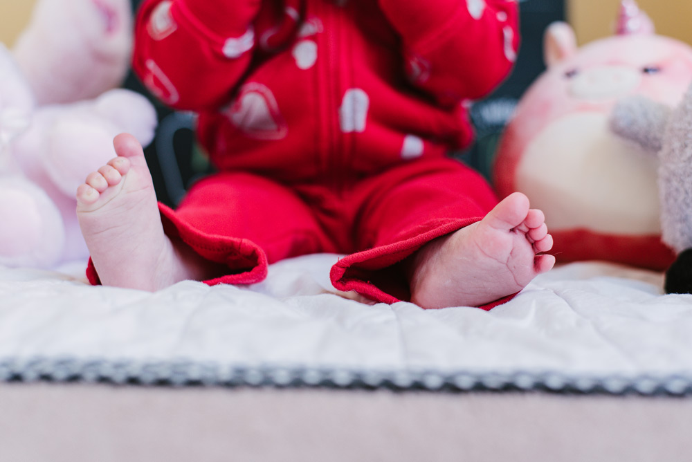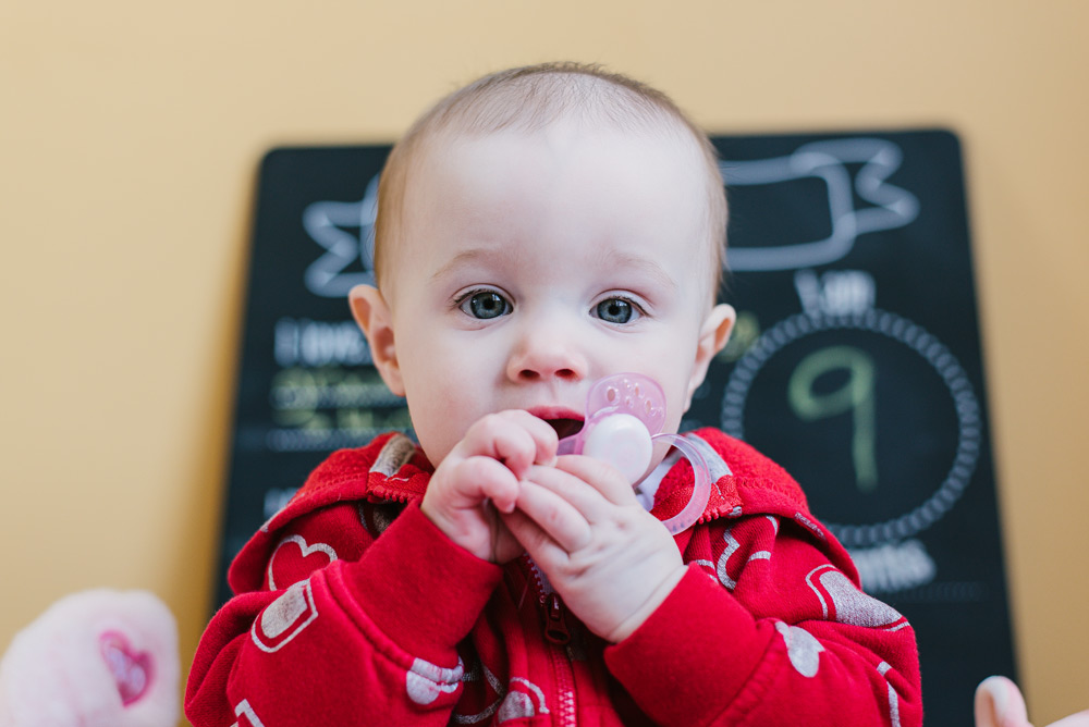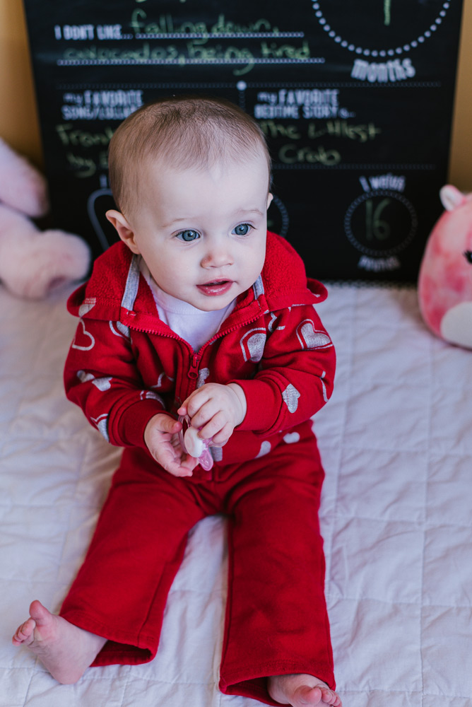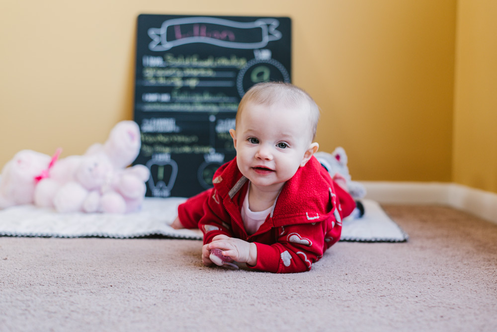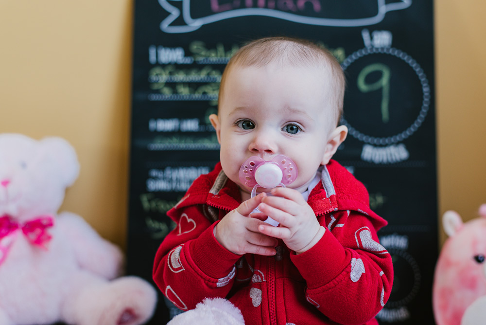 Baby Lily is nine months old. Photography is a great way to remember the fleeting moments of a quickly-growing baby! And, it’s always fun to add some personality to the photos through props and clothing. This month Lily celebrated Valentine’s Day with her heart outfit and favorite pink plushies.