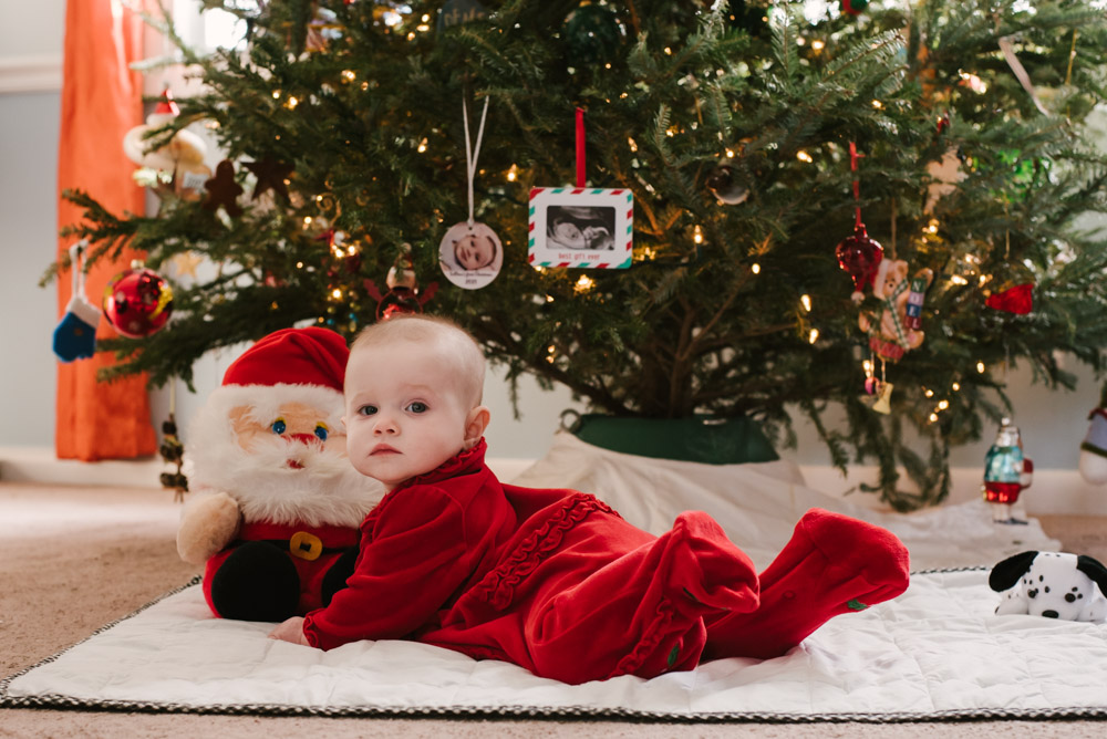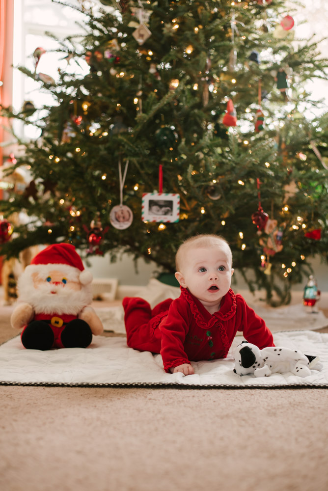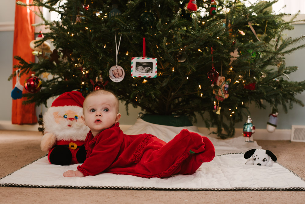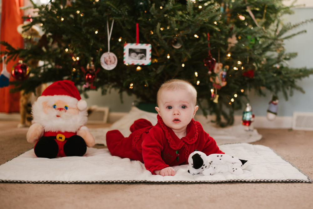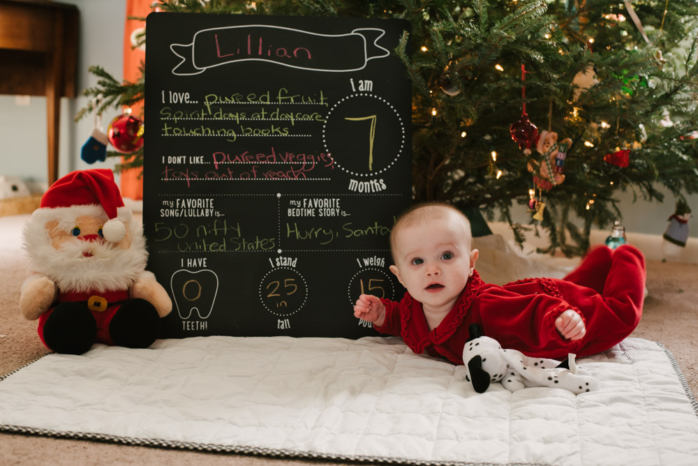 Baby Lily is seven months old. Photography is a great way to remember the fleeting moments of a quickly-growing baby! And, it’s always fun to add some personality to the photos through props and clothing. This month Lily celebrated her first Christmas!