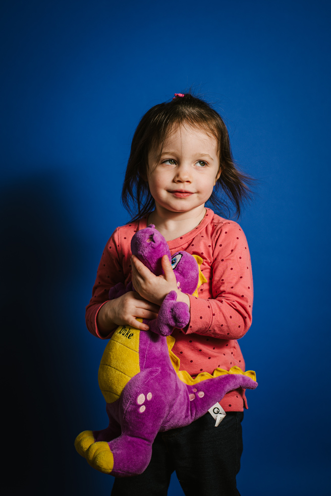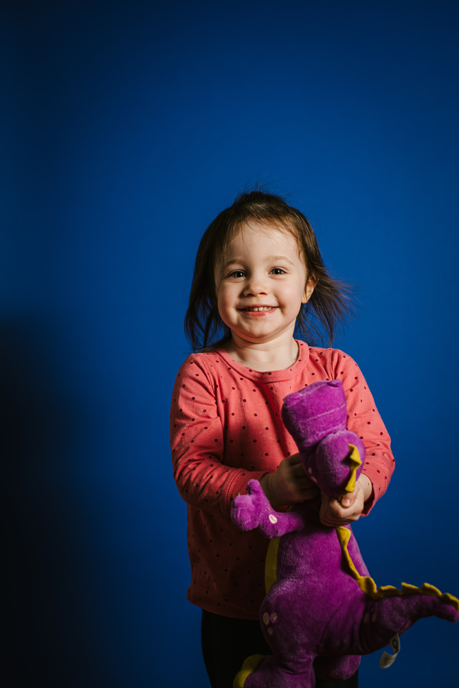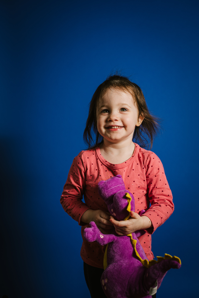 What began as a lighting as a text of some new backdrops became too cute to not share. Lily, with lots of cajoling and the help of her favorite, purple, friend Duke, posed in front of a new seamless paper backdrop.