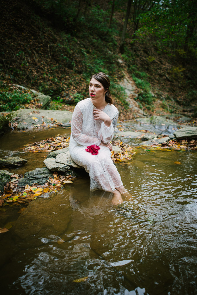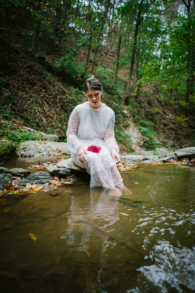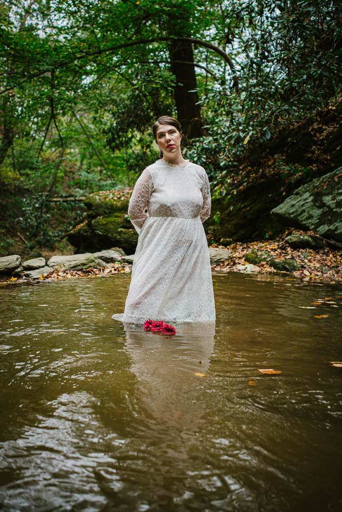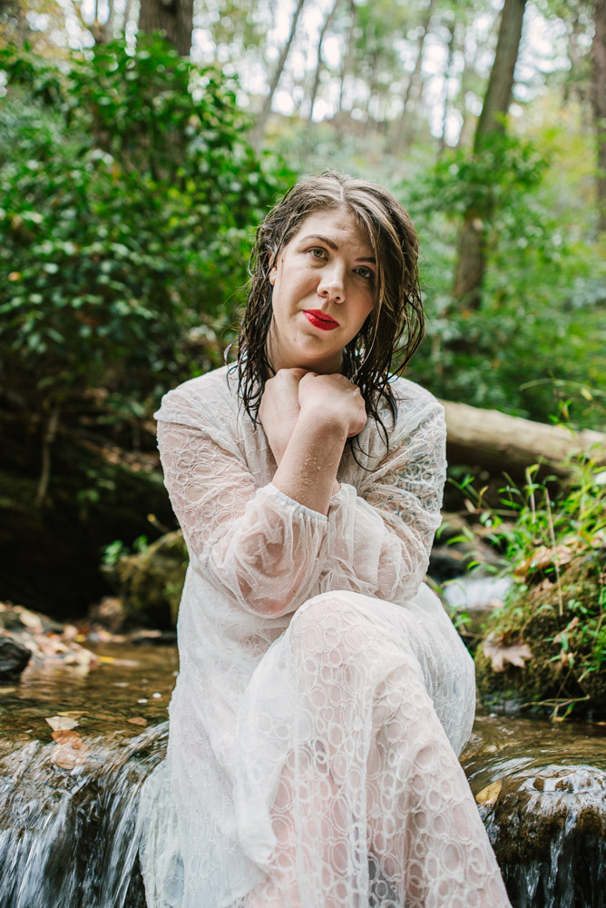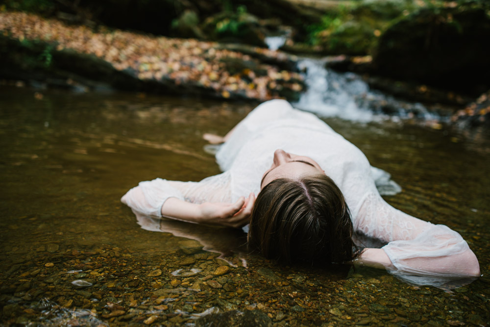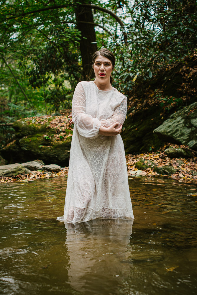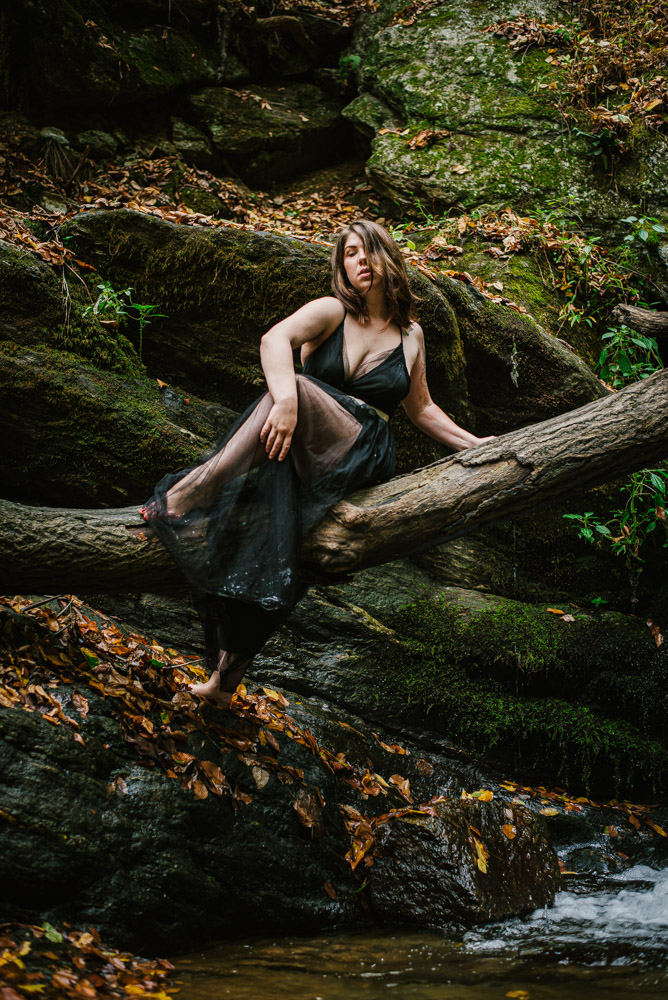Miya is a mom of three young girls, a photographer, and a model based in York, PA. We both wanted to explore capturing portraits with a moody and conceptual feel. The grey skies and fallen colorful leaves helped to set the mood as Miya bravely got into the cold water on a chilly day!