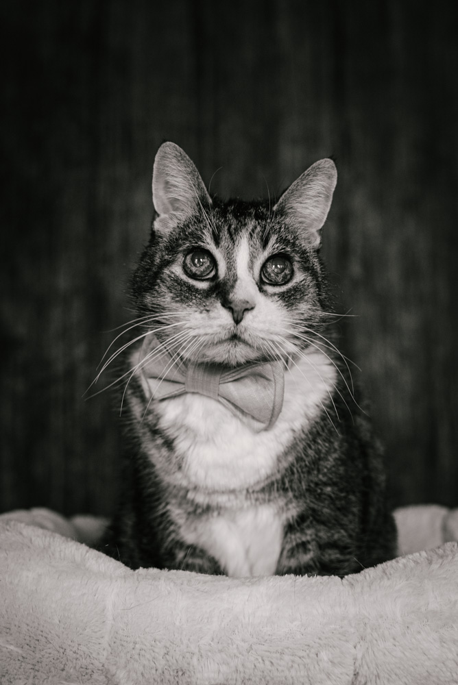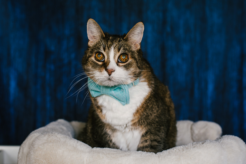 Oscar, Sébastien, and Sophia are three happy kitties living in Lancaster, PA. Oscar (above) is a senior cat. Due to health issues, it was important to his humans that he have the opportunity to have his portrait taken. To accommodate Oscar’s health, I was able to travel to the family’s home with a backdrop and lighting for the photoshoot. Oscar is very gentle and sat comfortably in his plush bed during the shoot—followed by some tasty treats.
