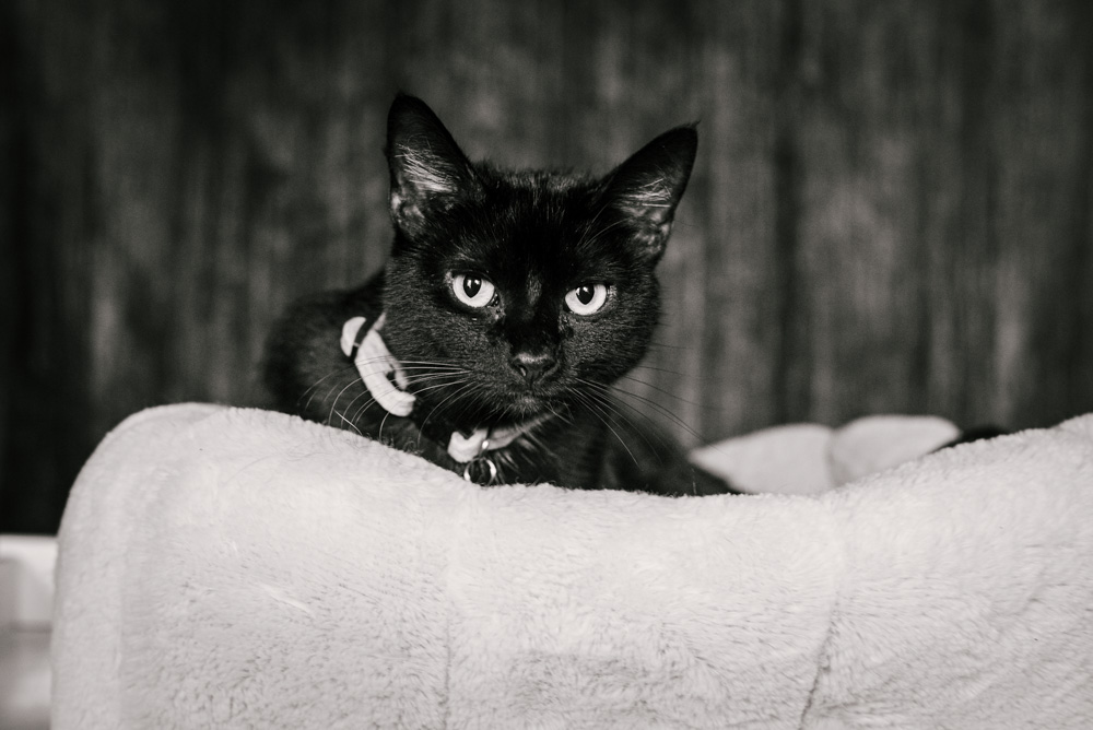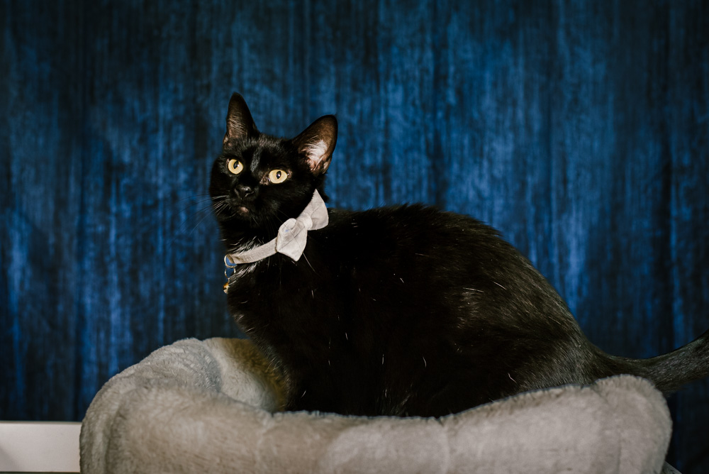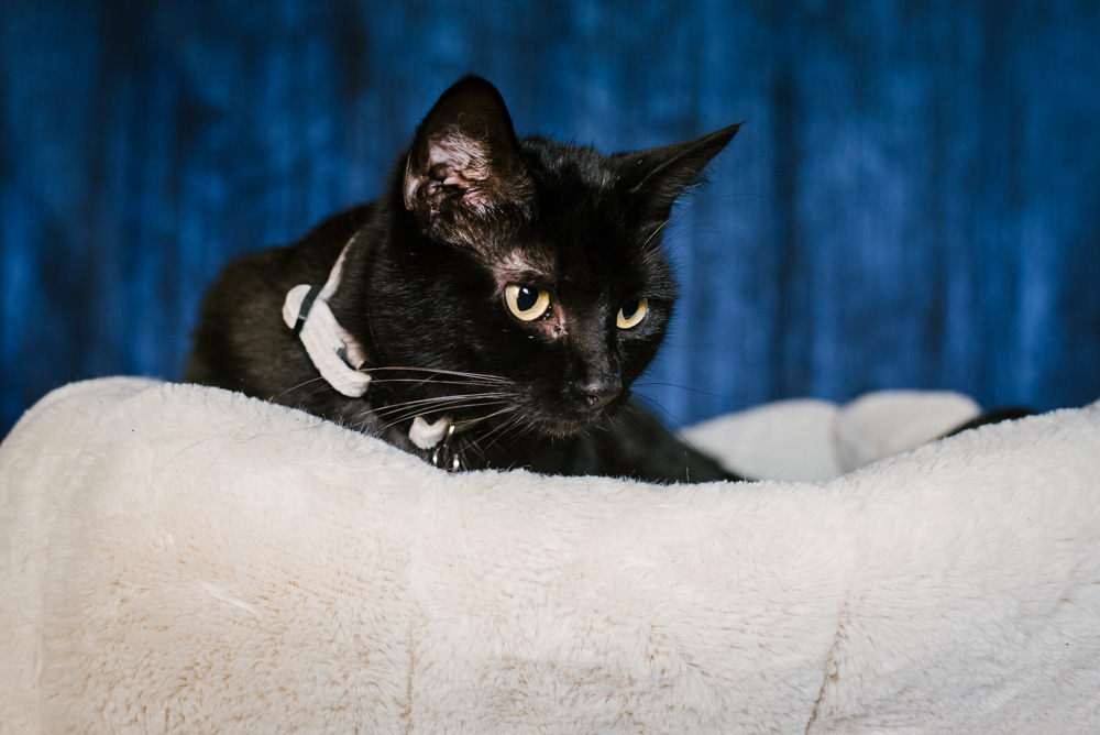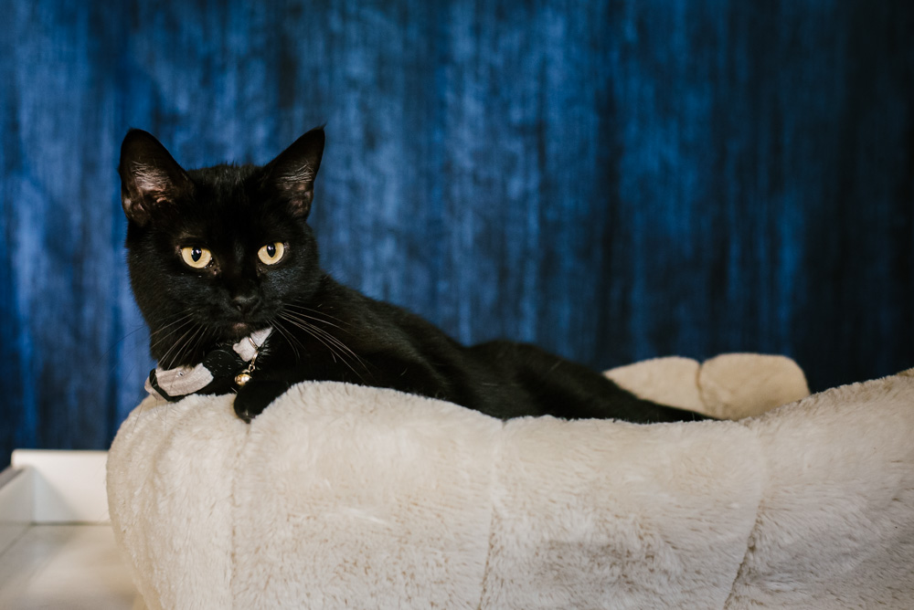 Sophia is the boy’s quiet sister. This black kitty is sleek and sauntered through the room during her brother’s portraits. When it was her turn in front of the camera, she immediately struck a regal pose with a hooked tail. She then laid down confidently for some beautiful portraits!