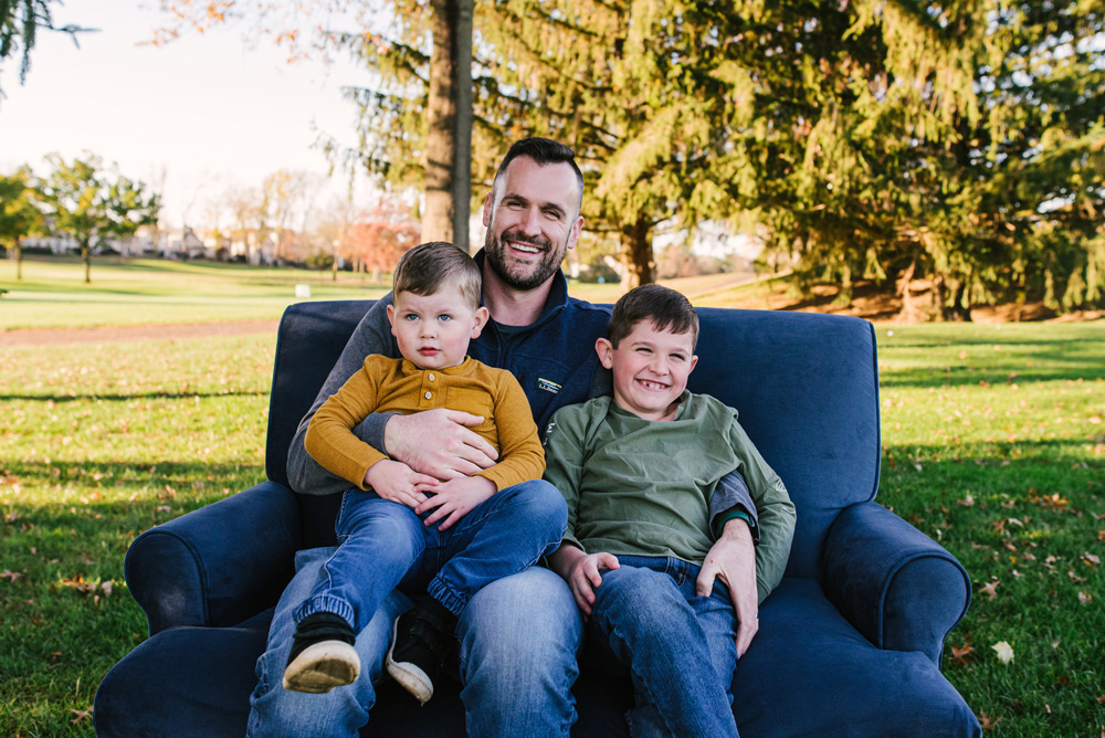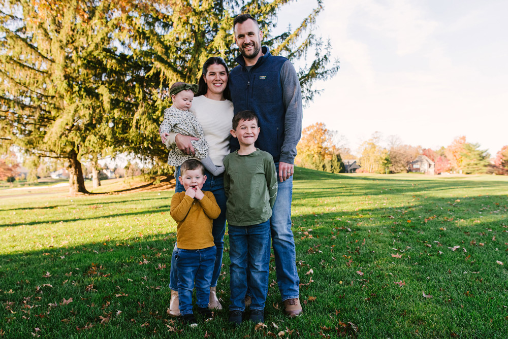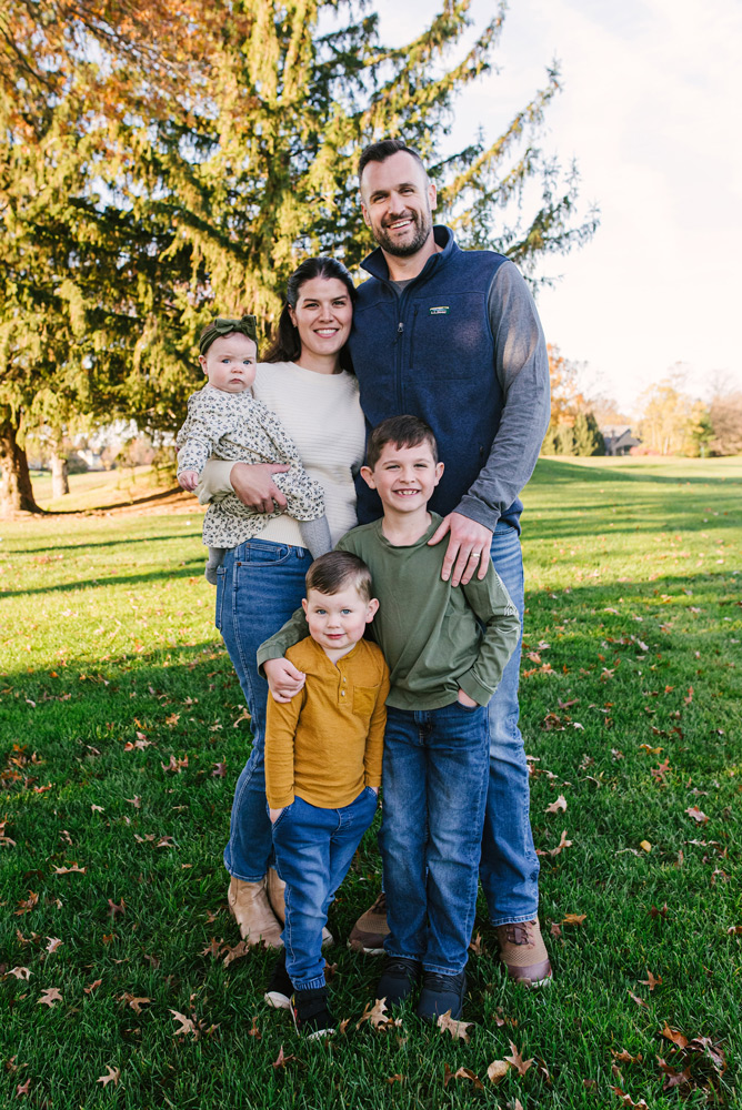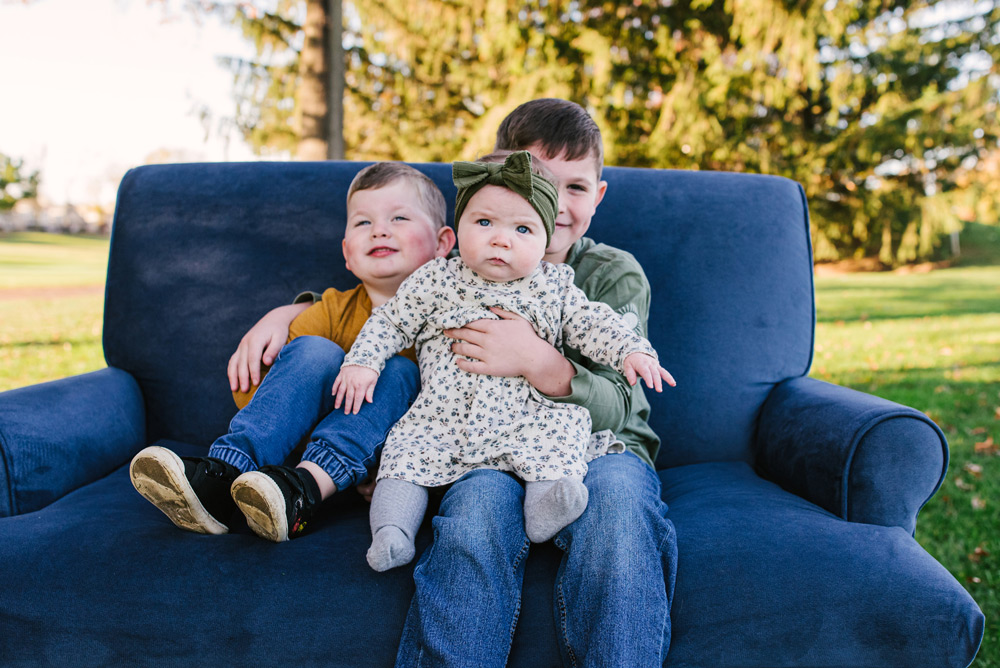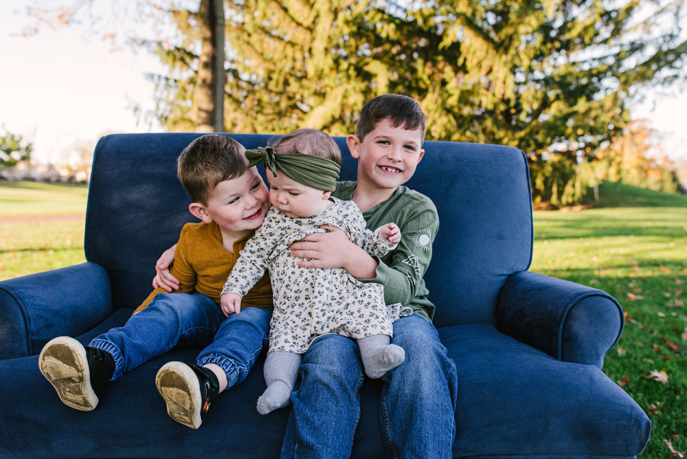Family portraits are a celebration of togetherness, and sometimes the simplest settings create the most meaningful memories. Picture a young couple with their two energetic boys and a precious infant girl, all gathered on a cozy blue sofa—the perfect spot to capture the essence of their family.