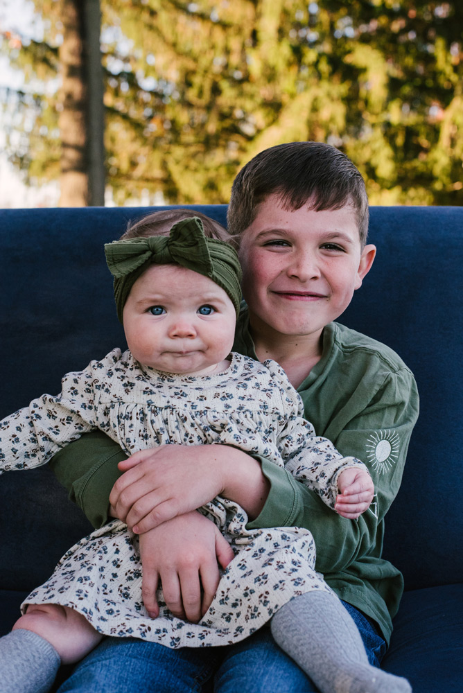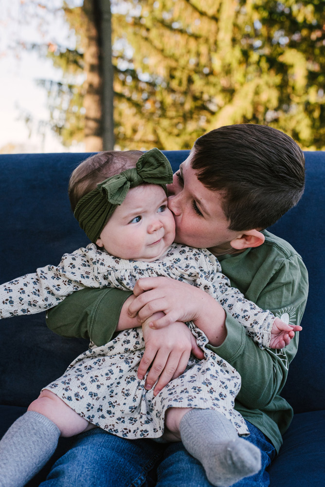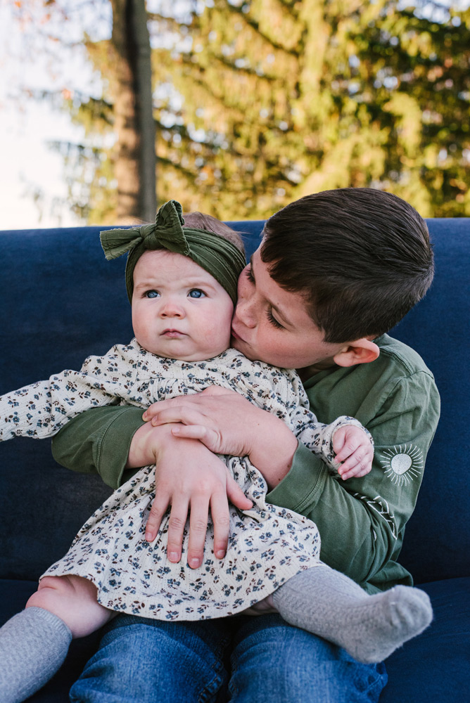 The blue sofa offers a stunning contrast to the family’s vibrant personalities. Its calm hue draws attention to the joyful chaos and tender moments shared within its embrace. From playful tickles and shared laughter to quiet cuddles and gazes of love, every interaction tells a unique chapter of their family’s journey.