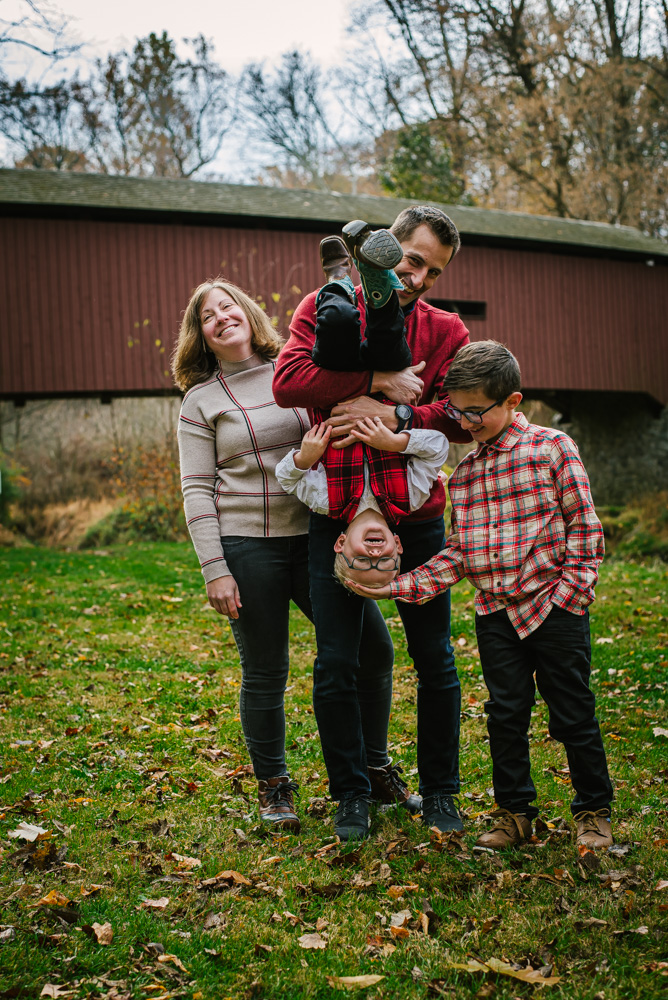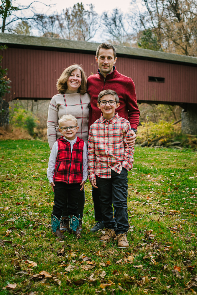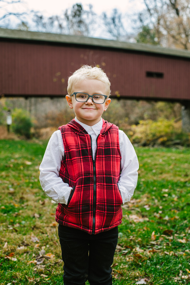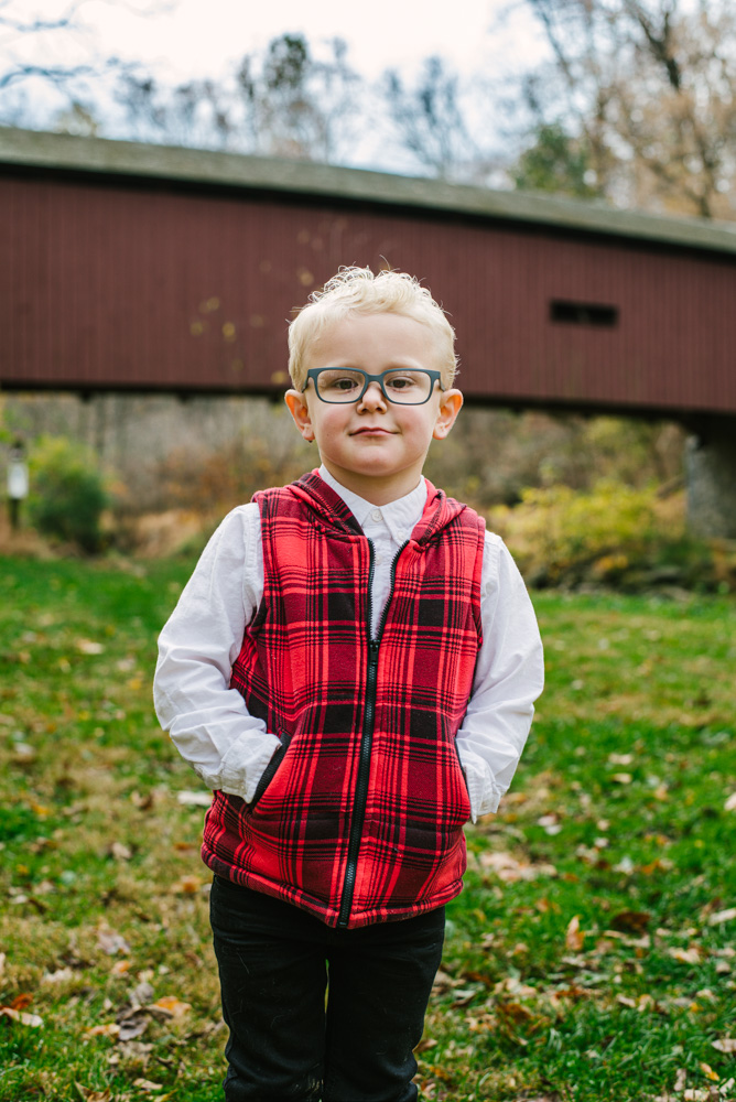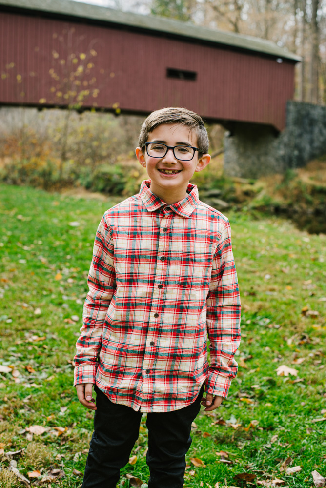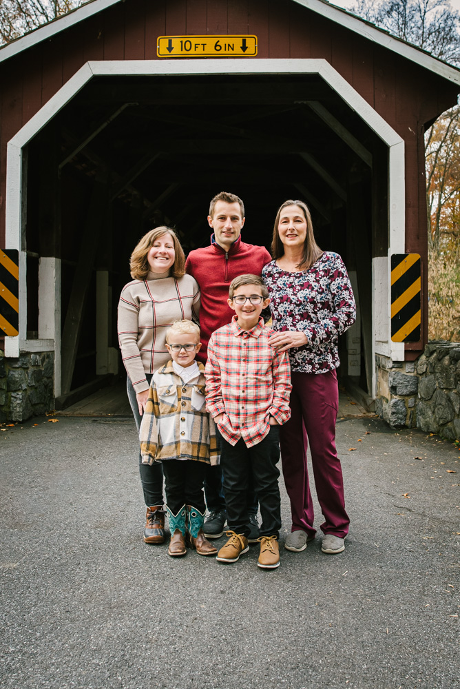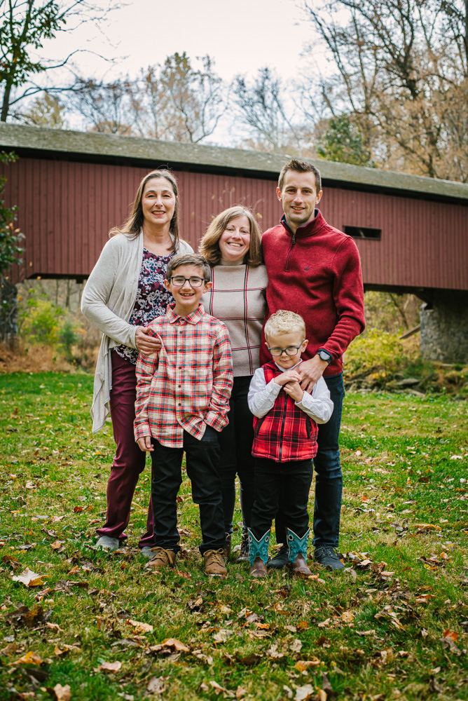 Three generations came together for family portraits by the Kurtz’s Mill Covered Bridge in Lancaster County Park. It was a beautiful Sunday is late fall with the leaves still hanging on to their branches – and Jack excitedly showed off a couple that had fallen!